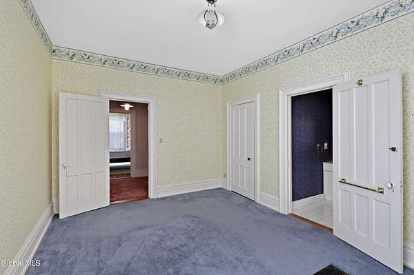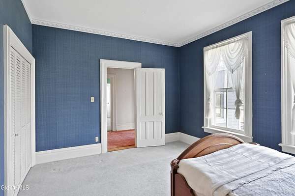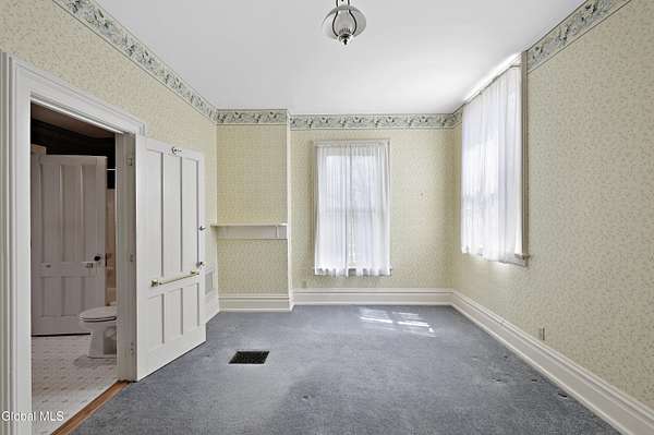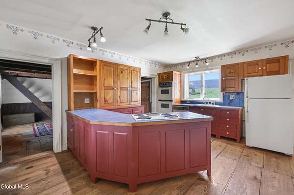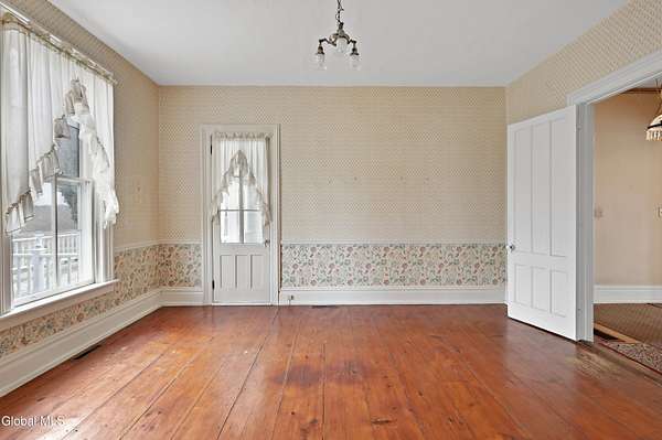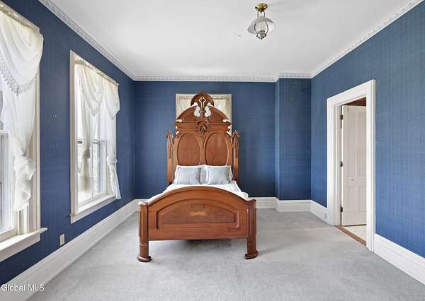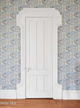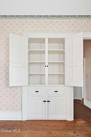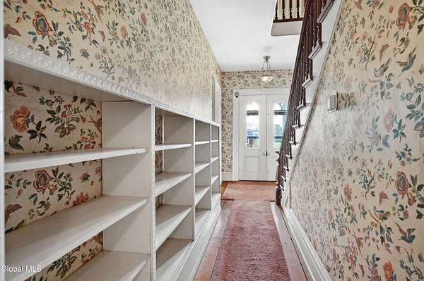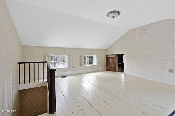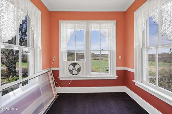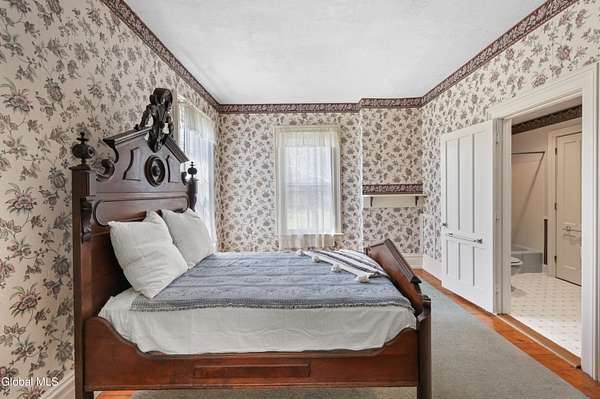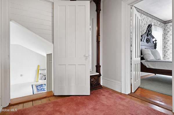 Step into a timeless blend of history and elegance with this remarkable 1800s Victorian Italianate estate, featuring an original section believed to date back to the 1700s. The front entrance welcomes you into a grand hall, where a magnificent walnut banister immediately showcases the home's exceptional craftsmanship and character. Throughout the home, impressively high ceilings enhance the sense of space and historic grandeur. Designed with both beauty and function in mind, the home features a stately office with pocket doors opening to a cozy sitting room. The living room flows seamlessly into the dining room through its own set of pocket doors, framed by intricately crafted woodwork that reflects the artistry of a bygone era. Just off the kitchen, the original section of the home now serves as a study, centered around a striking, oversized wood-burning fireplace complete with a traditional cooking crane--a rare and authentic historical feature. Solid, wide-plank floors run throughout, tying each room together with warmth and continuity. A convenient first-floor laundry combined with a half bath adds modern practicality. Upstairs, you'll find 5 bedrooms and 2 full baths, offering ample space for family and guests. Beyond the home, 116 picturesque acres stretch out toward the dramatic backdrop of the Helderberg Escarpment. Rich in history, the property is said to have been owned by brothers Matthias and Matthew Frederick, who purchased it in 1789 from Stephen Van Rensselaer; both brothers served in the Revolutionary War. The land has been thoughtfully maintained as a hobby farm, ideal for growing hay or simply enjoying a peaceful rural lifestyle. A small pond adds to the calming enjoyment of this unique property. The most recent owner, a master gardener and landscaper, has left a lasting legacy in the form of vibrant flower gardens & a carefully designed vegetable garden to be protected from wildlife.