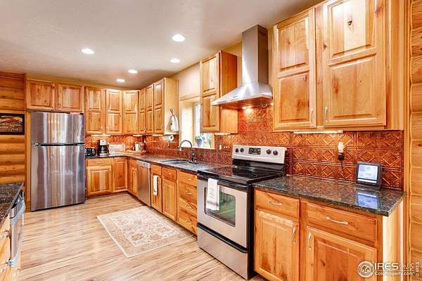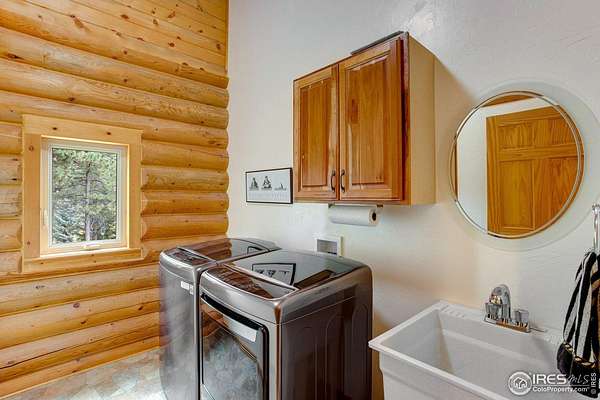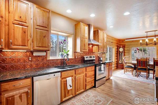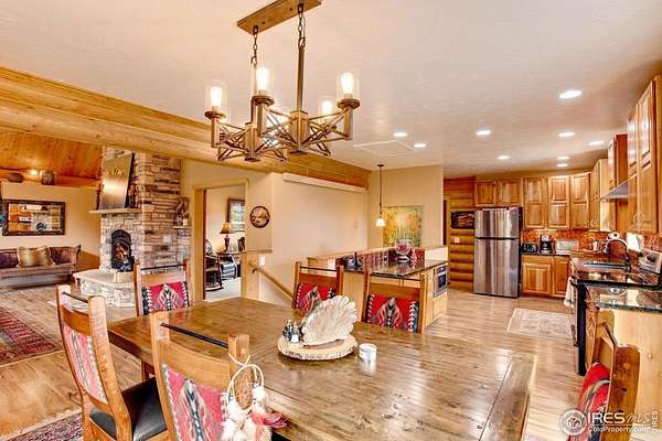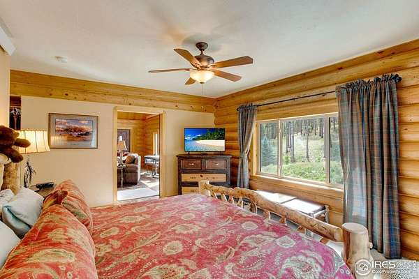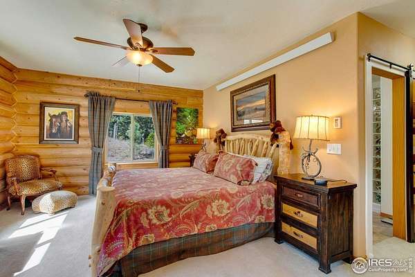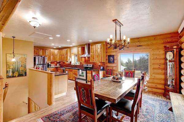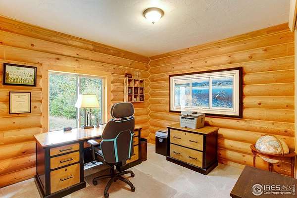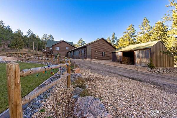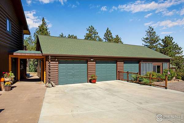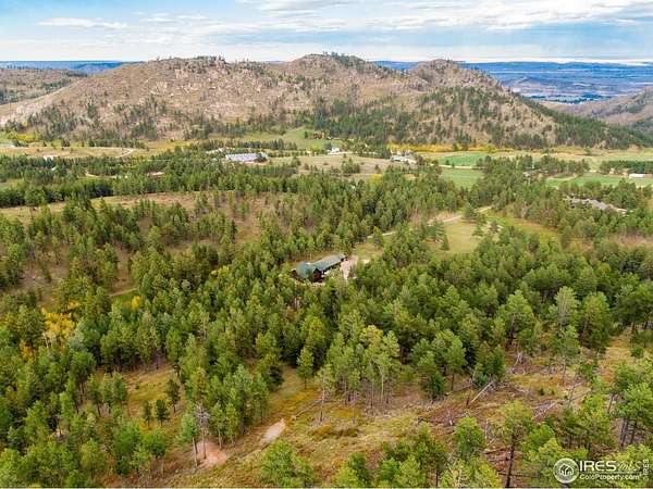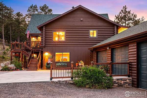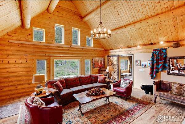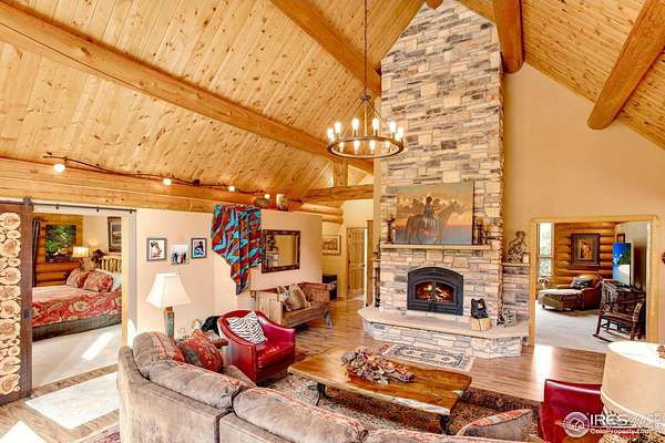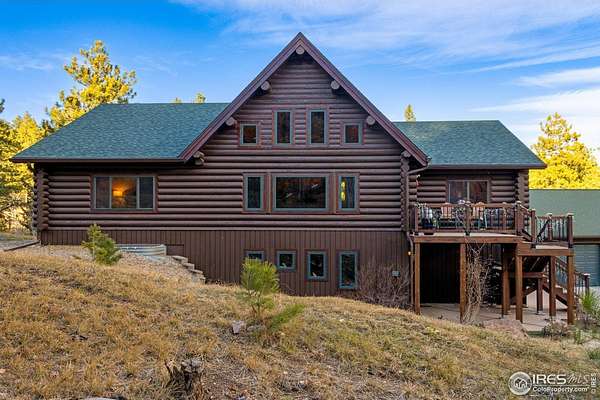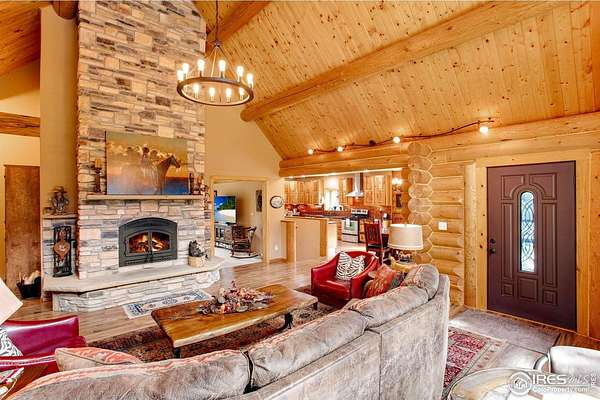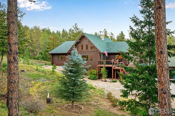 TURN KEY Option with all major furniture included. This luxurious log home sits on a 35-acre timbered lot and features abundant wildlife, a seasonal creek, rolling terrain, meadow and aspen grove. Located less than 30 minutes from Fort Collins, the property offers privacy and a true escape from the city. With 3,966 total sq. ft. and 3,638 finished, the home is solidly built and full of character and upgrades. Enter through a spacious grand foyer into a large living room with vaulted ceilings and an impressive floor-to-ceiling stone fireplace. The kitchen features granite slab counters, stainless steel appliances (all included), pantry, ample cabinetry and counter space. The primary suite offers a retreat with large closet and a 5-piece luxury bath including clawfoot tub, dual raised vanities and a spacious shower. Also on the main floor are a laundry, guest bedroom and an executive office that could serve as a TV room or formal living area. The walk-out basement includes a recreation room, family room with electric fireplace, wet bar, two additional guest bedrooms, a third full bath and two large storage areas, one designed as a cooled wine and food storage room. An attached 1,740 sq. ft. garage/shop provides ample space for vehicles and projects, complemented by a 625 sq. ft. covered wood storage area. Irrigated sodded area for fun and relaxation plus a front and back patio, water feature and so much more. Call today for a detailed feature list, floor plan or to schedule your private showing.