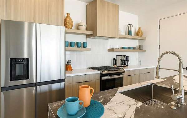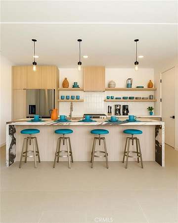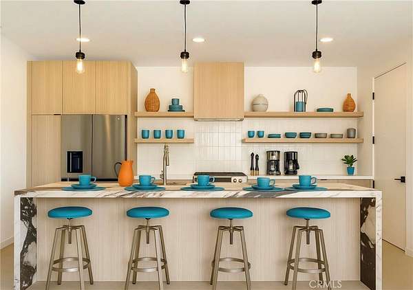 The chef's kitchen is both functional and stylish, showcasing a quartz waterfall island, custom European-style cabinetry, premium appliances, and a wine fridge--ideal for entertaining or enjoying everyday meals in style.