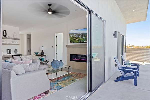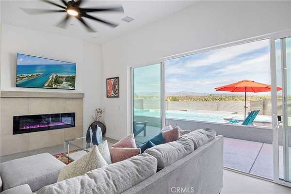The striking butterfly roofline and walls of glass frame panoramic views of Pipe Canyon and the San Gorgonio Mountains. Inside, the open-concept great room features soaring ceilings, polished concrete floors, and a sleek linear electric fireplace. Oversized sliding glass doors connect indoor living with the dramatic outdoor landscape, creating seamless flow throughout.