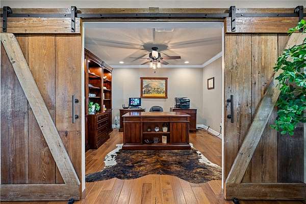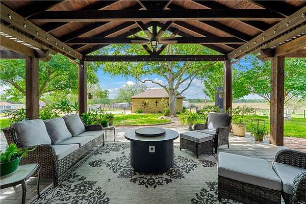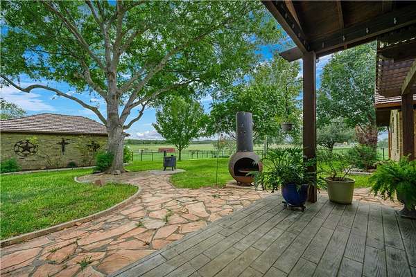 River View Ranch is a gorgeous home on 57.86 +/- acres surrounded by majestic trees, & a gentle slope down to the San Antonio River. Nestled on beautiful acres of Ag Exempt ranch land, this gorgeous renovated home boasts a little over 3100 sqft. The extensive renovation, completed in 2018, introduced custom Alder cabinets throughout, insulated windows, granite countertops, & two tankless water heaters. The living areas have gorgeous wood floors. The chef's kitchen is the true centerpiece of the home & a culinary enthusiast's dream. Boasting high-end appliances including a Thermidor 36" double oven, French door refrigerator & dishwasher, as well as an incredibly large sit-at island, farmhouse sink, & pot-filler above the gas stove. Entertaining will be a delight with comfortable seating for four at the island, as well as openness to the dining room & grand living room with stunning cathedral ceiling adorned with wood & exposed beams. The home features 3 bedrooms, 3 full bathrooms, a study, a second living/sitting area & multipurpose/game room. Storage is plentiful with a walk-in pantry & separate area with built-ins & room for additional refrigerators and/or freezers. A large laundry room includes a back door & third full bath. The primary retreat is a sanctuary of relaxation, abundant natural light from windows on two walls, a backdoor, & an ensuite with heated floors, a large stand-up shower, separate vanities, & a spacious walk-in closet. The hall bath is equally luxurious, equipped with a Kohler Bubble Massage Air Bath & a glass block walk-in shower. The game room, with its custom built-in entertainment center & hidden room. The covered back deck, complete with ceiling fans & mature trees shading the lush grass. The crown jewel of River View Ranch is the over 3,210 feet of San Antonio River frontage, featuring the gentle babbling sound of water as it flows over rock outcroppings adding to the property's serene and picturesque ambiance.