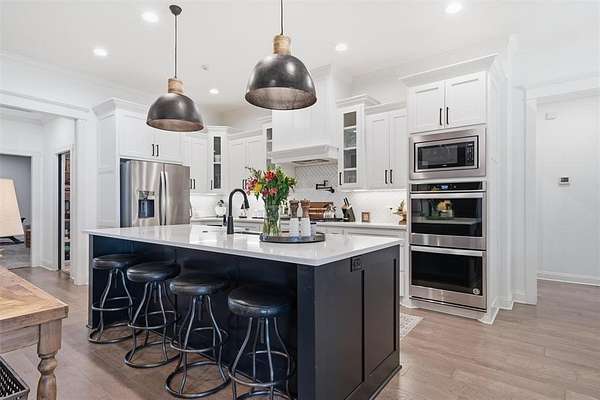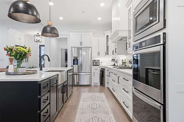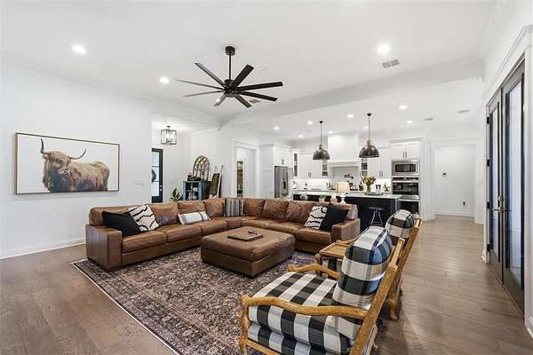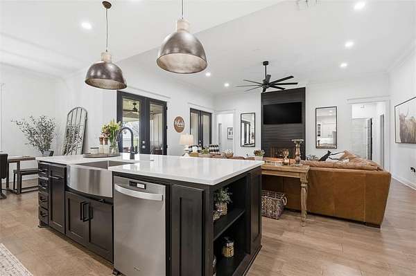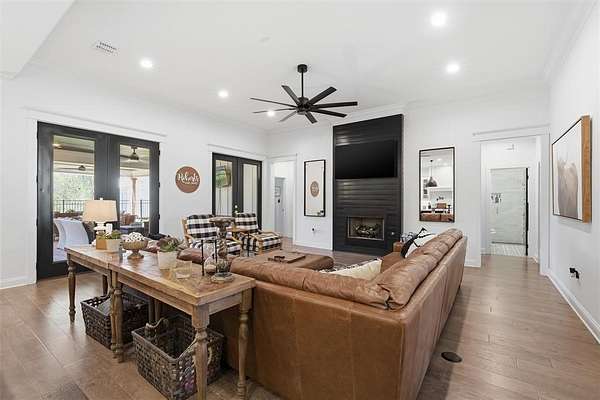 The open-concept living, kitchen, and dining area is filled with natural light, French doors, and a striking black fireplace. The gourmet kitchen features a large island, marble countertops, stainless steel appliances, wine fridge, pot filler, and an oversized walk-in pantry complete with an additional refrigerator—perfect for extra storage and entertaining.