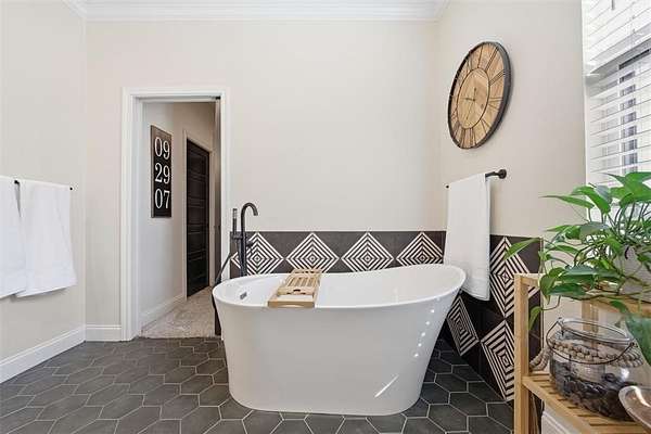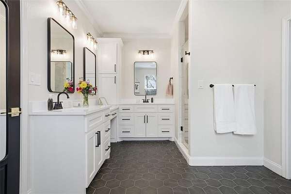 A thoughtfully designed mudroom provides functional everyday convenience with space to keep things organized and tidy. The private primary suite provides patio access, a soaking tub, tiled shower, dual vanities, and a walk-in closet with direct laundry access. Spacious secondary bedrooms provide comfort for family or guests.