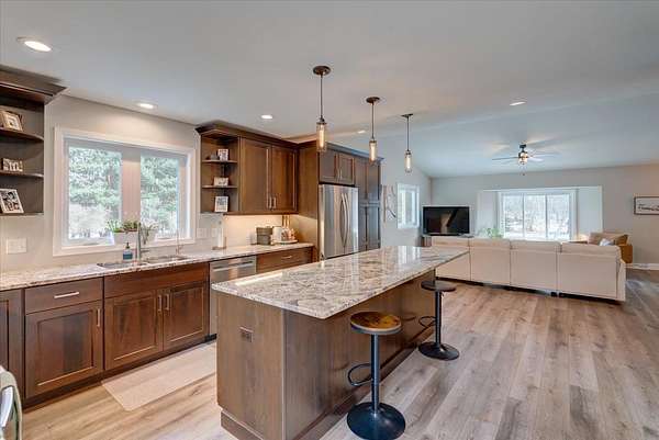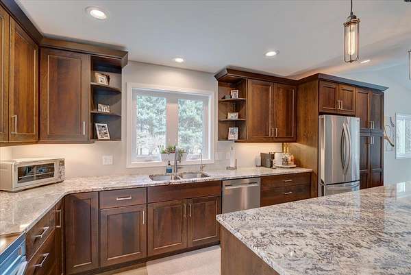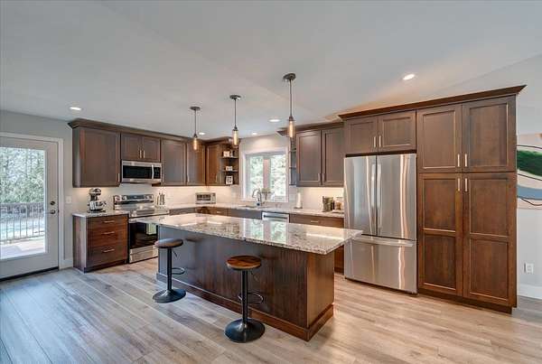 Showings start 2/4. Stunning home, great location, Town of Dunn, Oregon Schools & private 5 acres. From the minute you walk in you are greeted with a new large great room w/ vaulted ceilings, tons of windows, beautiful flooring, considerable dining area, views & amazing kitchen offering huge island, stainless steel app & loaded with cabinets, counter space & door to deck. Master is a true retreat w/dream walk-in closet & custom bath. The LL family room offers wet bar & patio doors leading to covered patio. Still lots of storage in LL. Extra 2+ garage great for all your toys & workshop. All older windows & one door were replaced in the last two years with transferable warranty. New driveway, well pump and pressure tank. New stove & tons of landscaping. The flow is perfect for entertaining.
