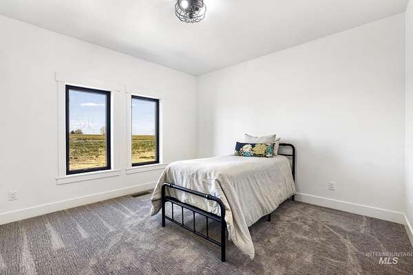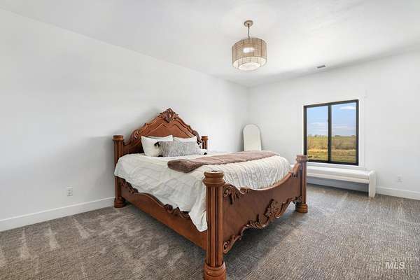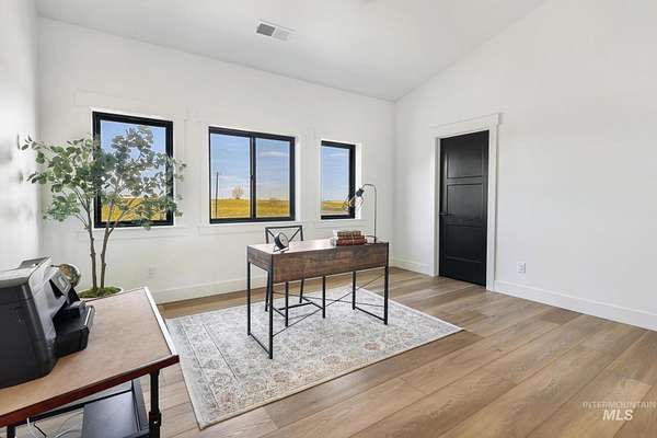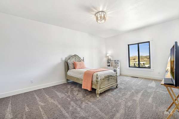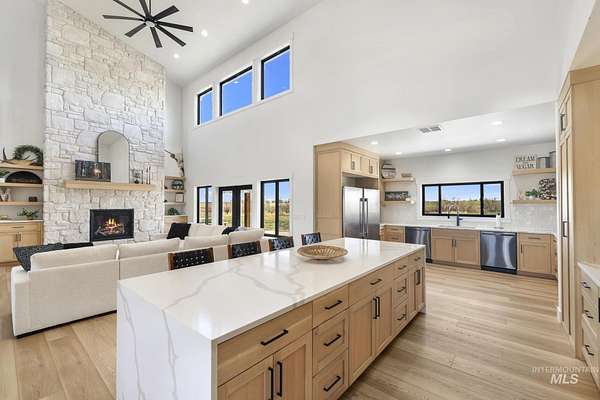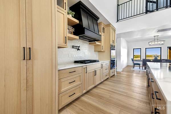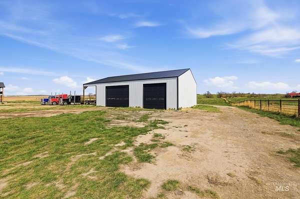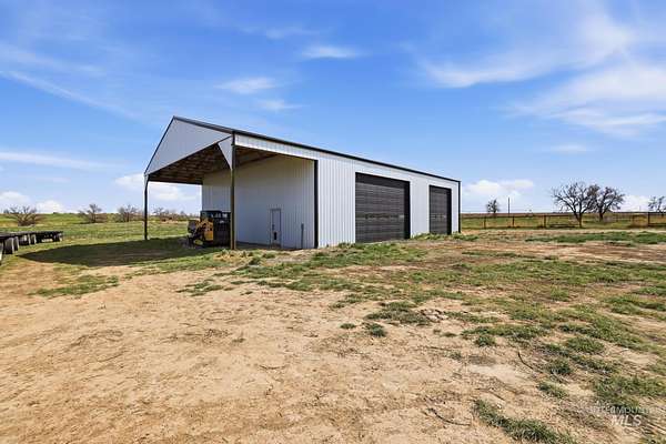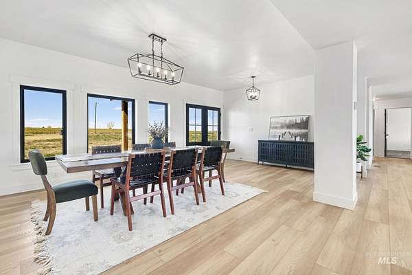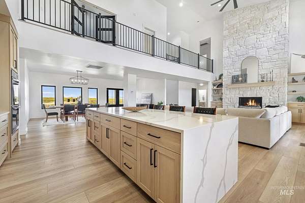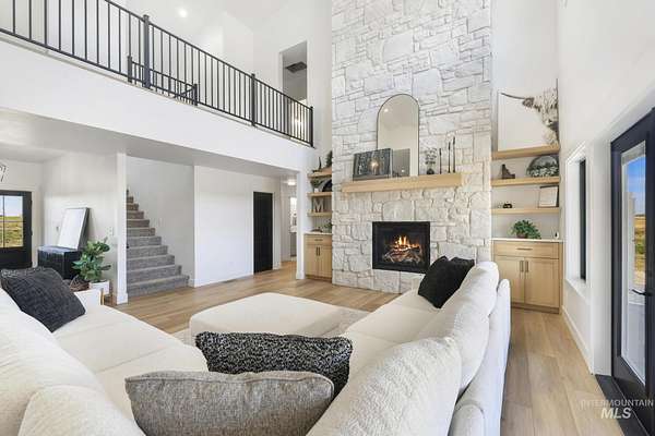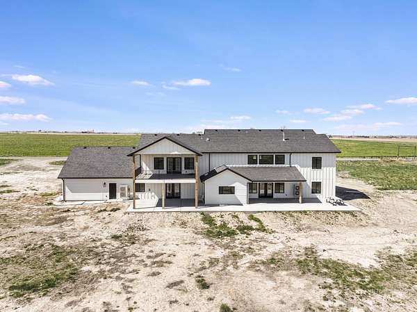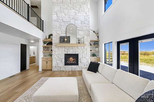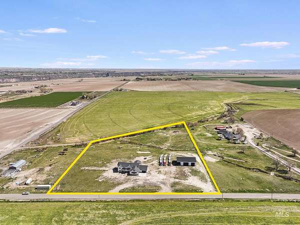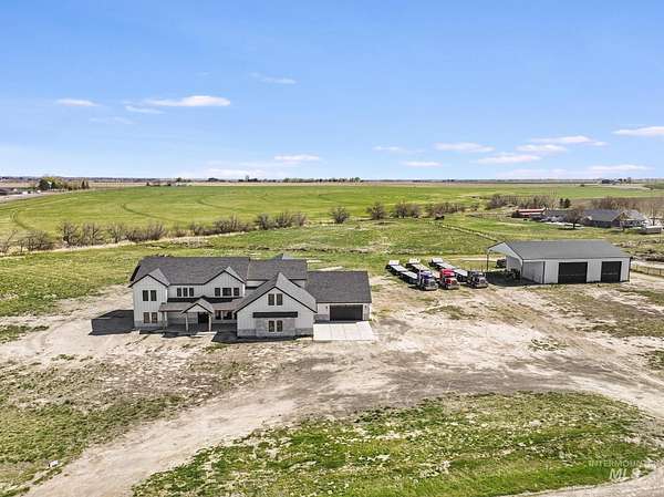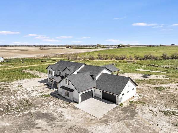 Experience the perfect blend of luxury, space, and Idaho beauty in this stunning 5,000+ sf estate set on 8 acres with 8 water shares and sweeping field views near the Snake River Canyon. Ideally located just 10 minutes from shopping, dining, and St. Luke's, this property offers both privacy and convenience. This spacious two-story offers 5 bedrooms, 3.5 baths, an office (optional 6th bedroom), plus a second living room upstairs with balcony access AND a bonus room! Inside, you'll find high-end finishes throughout, including Black Pine custom cabinetry, Andersen windows, and seamless white oak LVP flooring. The chef's kitchen is a showstopper with a massive granite island, double ovens, gas range with pot filler, two dishwashers, and a hidden walk-in pantry. The inviting living room centers around a floor-to-ceiling stone fireplace with built-ins on both sides. The luxurious primary suite offers private exterior access and a spa-like bathroom with a walk-in shower featuring multiple shower heads and a rain feature. The expansive walk-through closet connects directly to the laundry room and garage for ultimate functionality. Abundant storage, oversized closets, a charming mudroom with drinking fountain, spray foam insulation, and dual HVAC systems provide efficiency and comfort. Complete with a 50x75 SHOP featuring a large RV door, perfect for storage, hobbies, or equipment. NO CC&RS.