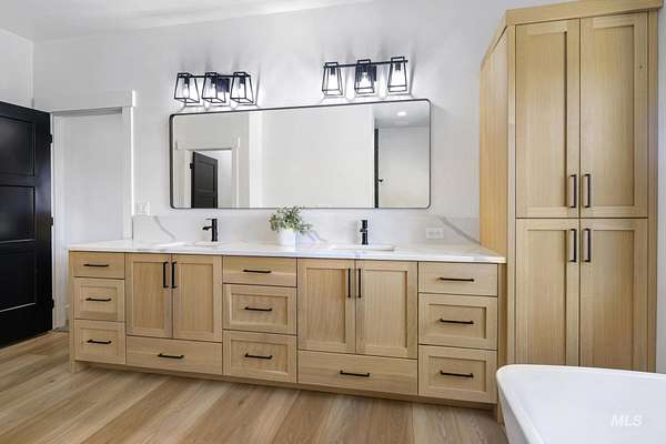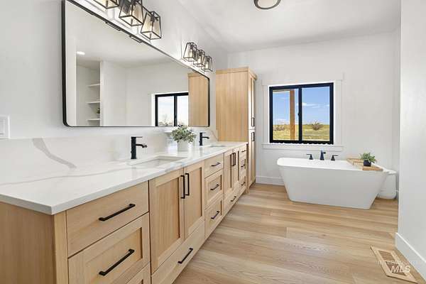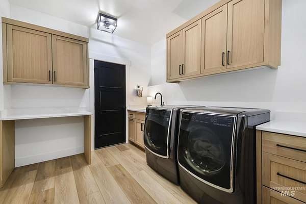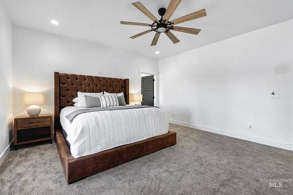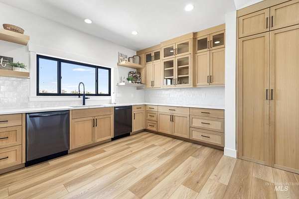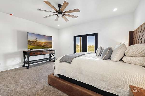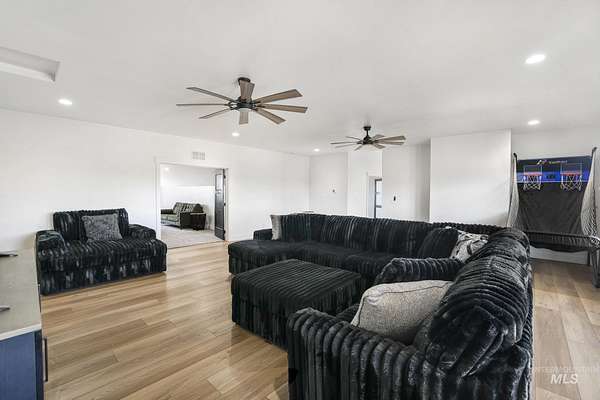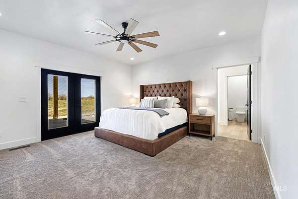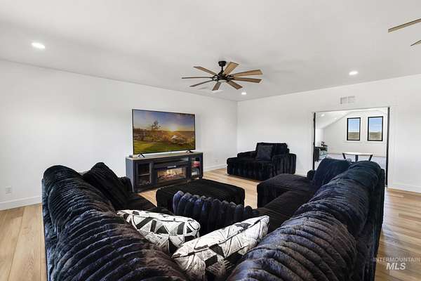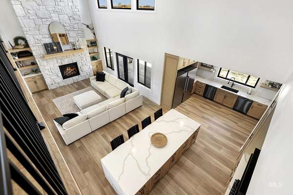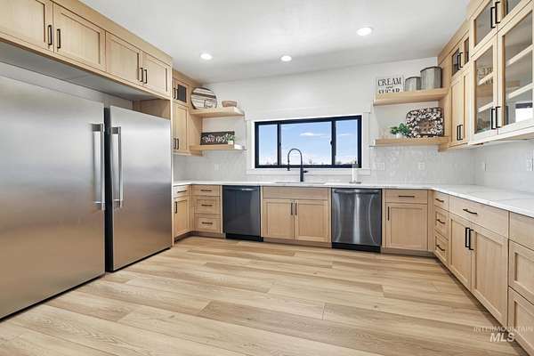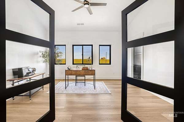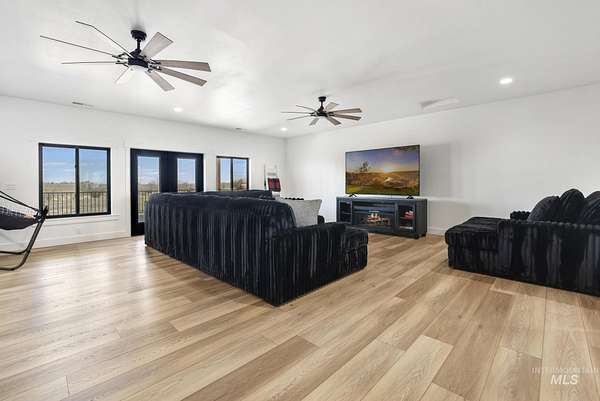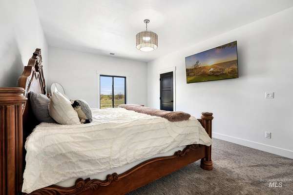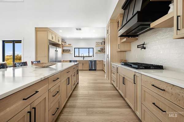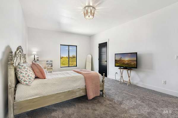Experience the perfect blend of luxury, space, and Idaho beauty in this stunning 5,000+ sf estate set on 8 acres with 8 water shares and sweeping field views near the Snake River Canyon. Ideally located just 10 minutes from shopping, dining, and St. Luke's, this property offers both privacy and convenience. This spacious two-story offers 5 bedrooms, 3.5 baths, an office (optional 6th bedroom), plus a second living room upstairs with balcony access AND a bonus room! Inside, you'll find high-end finishes throughout, including Black Pine custom cabinetry, Andersen windows, and seamless white oak LVP flooring. The chef's kitchen is a showstopper with a massive granite island, double ovens, gas range with pot filler, two dishwashers, and a hidden walk-in pantry. The inviting living room centers around a floor-to-ceiling stone fireplace with built-ins on both sides. The luxurious primary suite offers private exterior access and a spa-like bathroom with a walk-in shower featuring multiple shower heads and a rain feature. The expansive walk-through closet connects directly to the laundry room and garage for ultimate functionality. Abundant storage, oversized closets, a charming mudroom with drinking fountain, spray foam insulation, and dual HVAC systems provide efficiency and comfort. Complete with a 50x75 SHOP featuring a large RV door, perfect for storage, hobbies, or equipment. NO CC&RS.