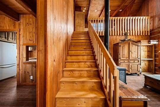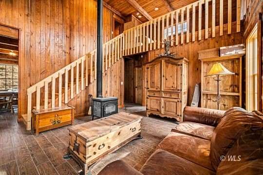 - Wood (Softwood) Tile/Clay, Flooring Ceiling Fans, Wood Burning Stove, Vaulted Ceilings, Flooring