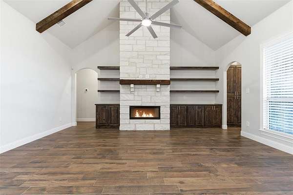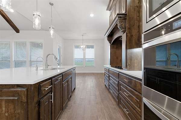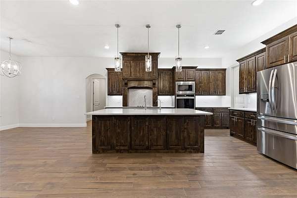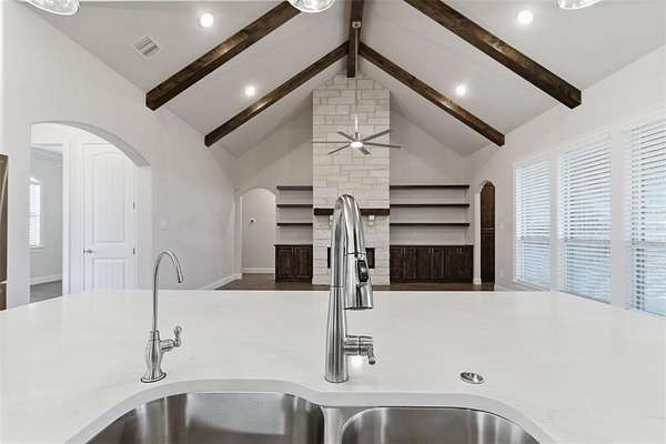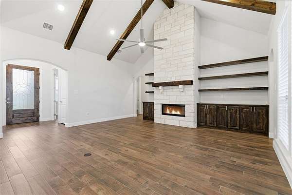 Welcome to peaceful country living on 2 beautifully maintained acres in the quiet gated community of Deer Ridge Estates. Built in 2023, this thoughtfully designed home offers modern luxury, functionality, and privacy while still being just minutes from shopping, dining, and everyday conveniences. The heart of the home is a stunning kitchen featuring quartz countertops, an oversized island perfect for gathering and entertaining, double oven, and a large walk-in butler’s pantry that provides exceptional storage and organization. The kitchen opens seamlessly to the main living area where soaring ceilings with beautiful exposed beams create a dramatic focal point. The living room is filled with natural light and anchored by a stylish electric fireplace, creating a warm and inviting space. A dedicated office provides the perfect work-from-home space, while the large bonus room offers incredible flexibility and can easily serve as a fourth bedroom, media room, playroom, or additional living area. The luxurious primary suite offers a true retreat with separate vanities, a stunning oversized shower, a relaxing jetted soaking tub, and a massive walk-in closet with third-row storage for maximum organization. The secondary bedrooms are spacious, each featuring walk-in closets, and are conveniently served by a full third bathroom. Upgraded lighting, nickel hardware, custom built-in cabinetry, and thoughtful storage throughout the home. The oversized three-car garage features 10-foot ceilings and includes a large storage room with built-in shelving. Other upgrades include Gigabit Ethernet for high-speed connectivity, reverse osmosis system, water softener, two water heaters, and a spacious walk-in attic for even more storage. Outdoor features include brick-paved patios, timer-controlled exterior lighting, and plenty of space to add a pool, shop, or your dream outdoor kitchen. This exceptional property offers the space, comfort, and flexibility to create your ideal lifestyle.