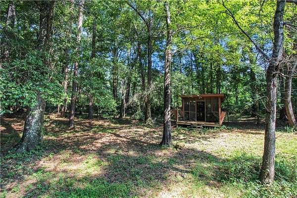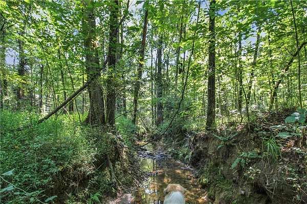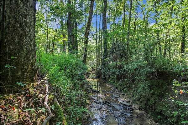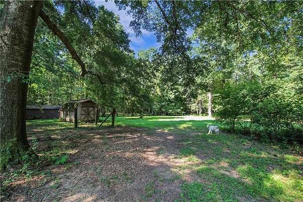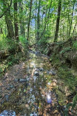 The property features a picturesque creek, three shop/outbuildings, a chicken coop, fig and pear trees, blueberry bushes, and several small pastures surrounded by mature hardwoods. It's ideal for a hobby farm or for keeping up to three horses.