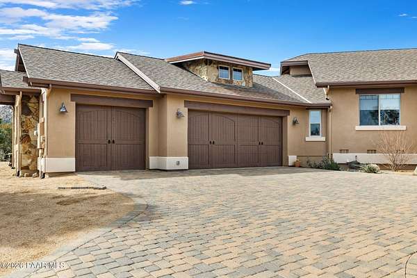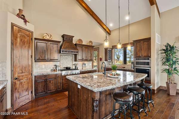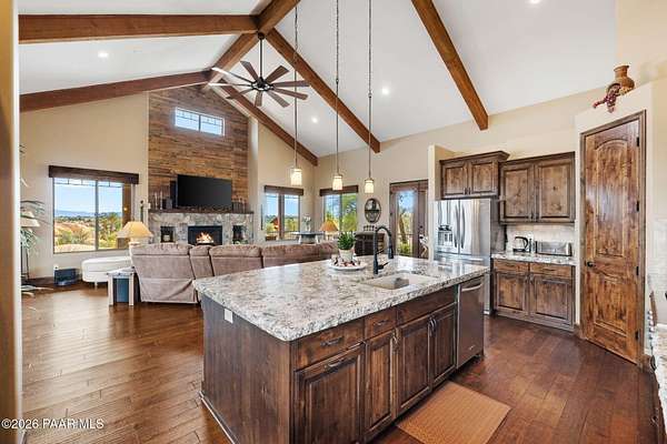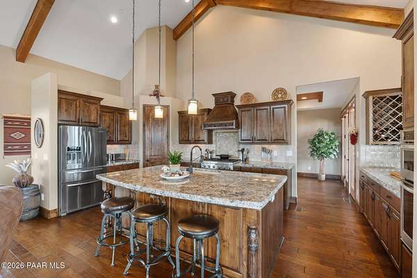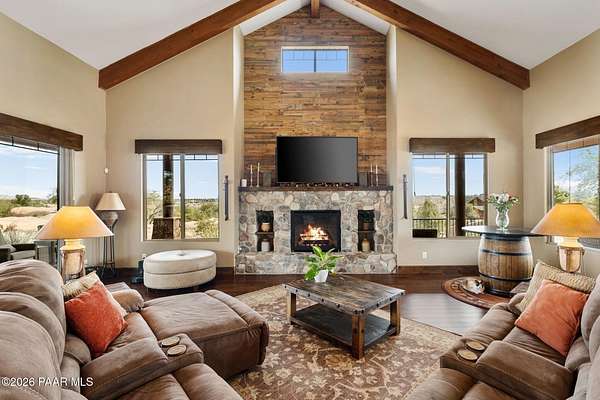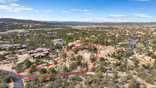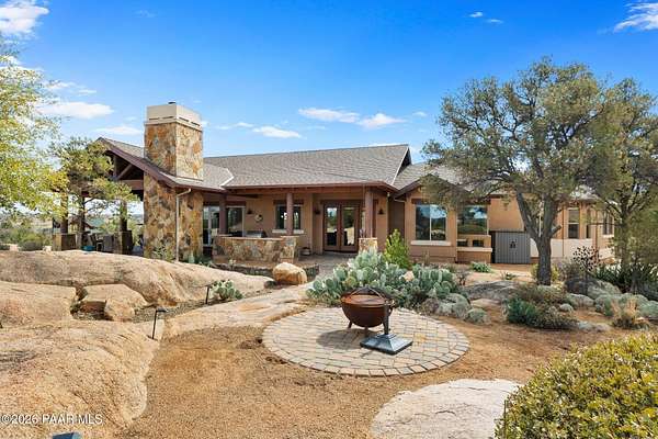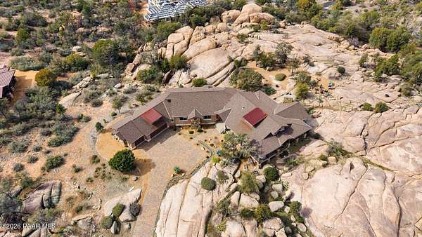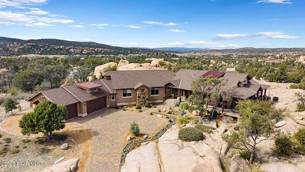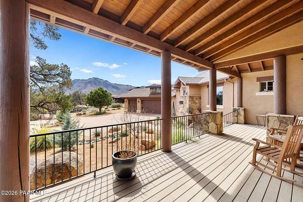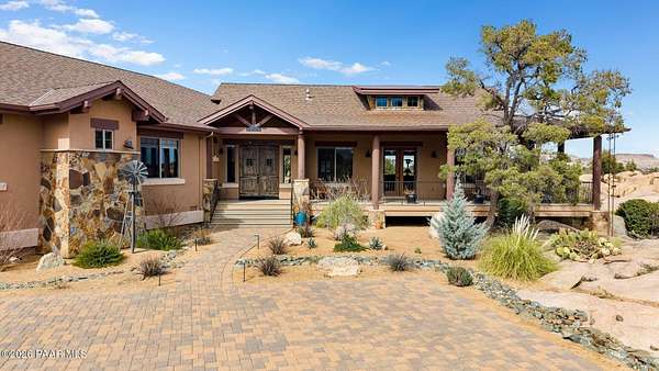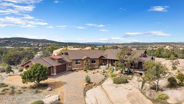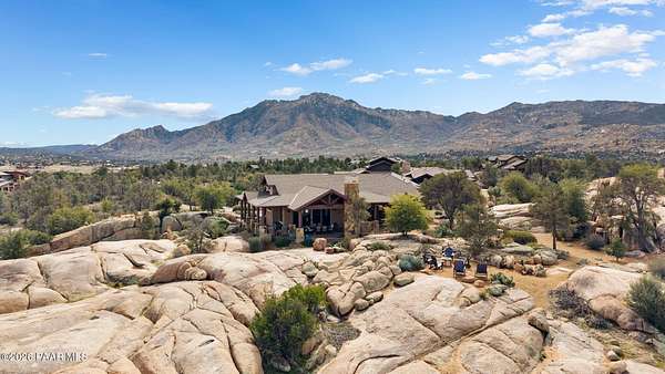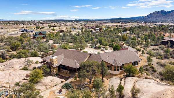 Experience the rare combination of privacy, breathtaking mountain views, and luxury living in this stunning custom home located in the prestigious American Ranch community in Prescott, Arizona.Perfectly positioned on 1.6 acres and backing to 19 acres of untouched HOA-owned open space, this property offers an extraordinary sense of peace and protection of your views--ensuring that the natural beauty surrounding you will remain forever preserved. From nearly every vantage point of the home, enjoy panoramic views of Granite Mountain, dramatic boulder outcroppings, and the distant San Francisco Peaks, creating a daily backdrop that defines the Northern Arizona lifestyle.This 3,452 square foot single-level custom home was thoughtfully designed to embrace the surrounding landscape while delivering refined comfort. Inside, the home welcomes you with a grand great room featuring vaulted and beamed ceilings, peeled pole architectural accents, rich hardwood flooring, and a striking stone fireplace that anchors the living space. Large windows frame the incredible scenery and fill the home with natural light.The open-concept floor plan seamlessly connects the great room, formal dining area, and chef's kitchen--making it ideal for both entertaining and everyday living. The kitchen is beautifully appointed with knotty alder cabinetry, chiseled-edge granite countertops, stainless steel Thermador appliances, a 6-burner gas cooktop, wall oven, built-in microwave, and an oversized pantry, creating a space that is both functional and elegant.The luxurious primary suite is a true retreat featuring a coffered ceiling, spa-inspired bathroom with dual granite vanities, soaking tub, walk-in shower with glass block detail, and an expansive custom walk-in closet.Each of the three spacious bedrooms includes its own en-suite bathroom, providing comfort and privacy for family and guests. A dedicated den/office offers the perfect space for working remotely or creating a private library or media room.Outdoor living is where this property truly shines. The home features a wraparound veranda and expansive paver patio designed to take full advantage of the spectacular scenery. Enjoy evenings around the outdoor gas fireplace, entertain with the built-in BBQ, or relax while watching the sunset over Granite Mountain. The property also includes raised garden beds, mature landscaping, and a unique natural boulder plateau that blends seamlessly with the surrounding terrain.Additional highlights include: 3-car garage brick paver driveway and walkways zoned heating and cooling full fire suppression system spacious laundry room with cabinetry, granite counters, and sinkLocated in the highly sought-after American Ranch gated community, residents enjoy access to equestrian facilities, riding trails, a community clubhouse, fitness center, pool, and the wide-open beauty of Prescott's high country.This is a rare opportunity to own a luxury Prescott home with acreage, protected open space, and iconic Granite Mountain views--all just minutes from downtown Prescott.