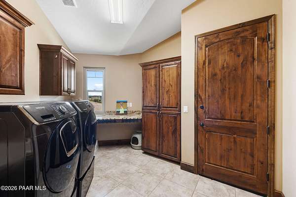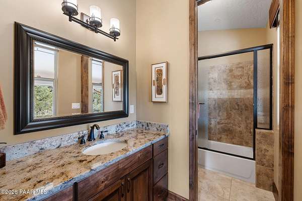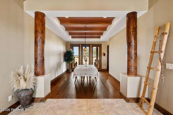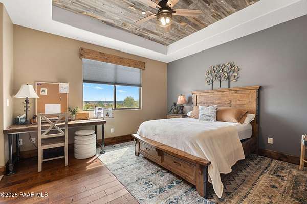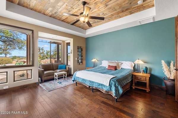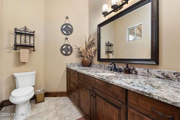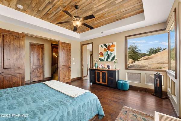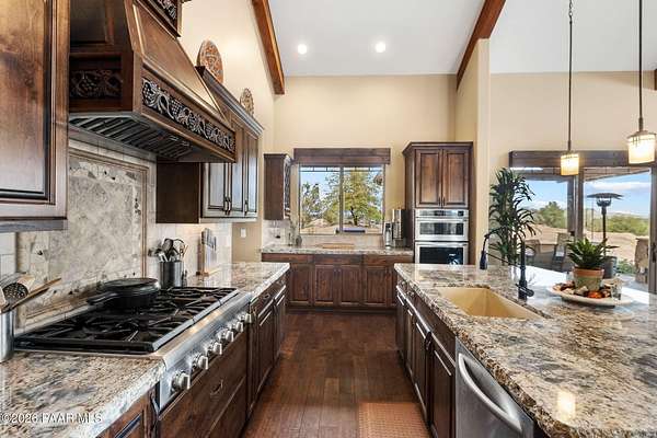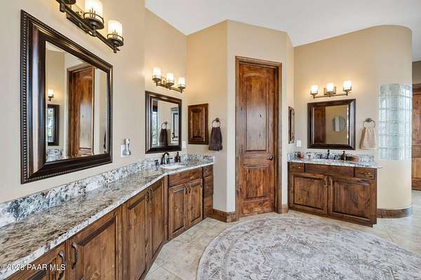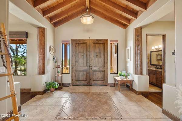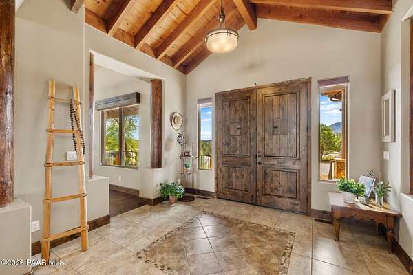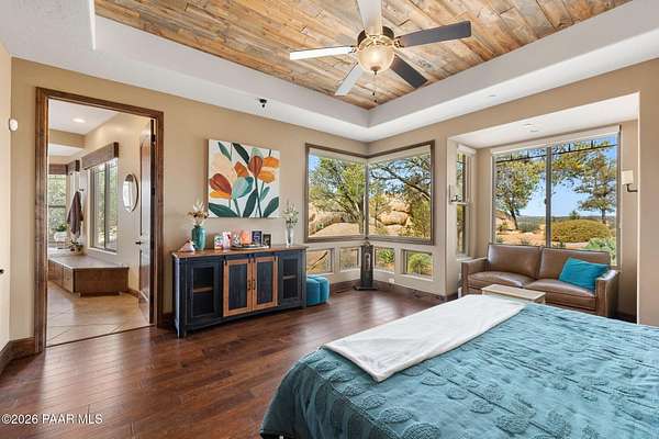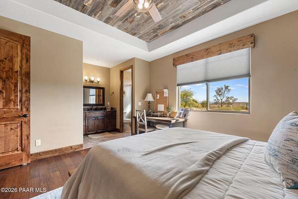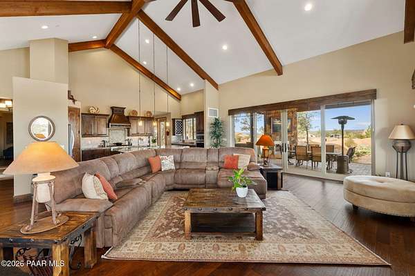 Experience the rare combination of privacy, breathtaking mountain views, and luxury living in this stunning custom home located in the prestigious American Ranch community in Prescott, Arizona.Perfectly positioned on 1.6 acres and backing to 19 acres of untouched HOA-owned open space, this property offers an extraordinary sense of peace and protection of your views--ensuring that the natural beauty surrounding you will remain forever preserved. From nearly every vantage point of the home, enjoy panoramic views of Granite Mountain, dramatic boulder outcroppings, and the distant San Francisco Peaks, creating a daily backdrop that defines the Northern Arizona lifestyle.This 3,452 square foot single-level custom home was thoughtfully designed to embrace the surrounding landscape while delivering refined comfort. Inside, the home welcomes you with a grand great room featuring vaulted and beamed ceilings, peeled pole architectural accents, rich hardwood flooring, and a striking stone fireplace that anchors the living space. Large windows frame the incredible scenery and fill the home with natural light.The open-concept floor plan seamlessly connects the great room, formal dining area, and chef's kitchen--making it ideal for both entertaining and everyday living. The kitchen is beautifully appointed with knotty alder cabinetry, chiseled-edge granite countertops, stainless steel Thermador appliances, a 6-burner gas cooktop, wall oven, built-in microwave, and an oversized pantry, creating a space that is both functional and elegant.The luxurious primary suite is a true retreat featuring a coffered ceiling, spa-inspired bathroom with dual granite vanities, soaking tub, walk-in shower with glass block detail, and an expansive custom walk-in closet.Each of the three spacious bedrooms includes its own en-suite bathroom, providing comfort and privacy for family and guests. A dedicated den/office offers the perfect space for working remotely or creating a private library or media room.Outdoor living is where this property truly shines. The home features a wraparound veranda and expansive paver patio designed to take full advantage of the spectacular scenery. Enjoy evenings around the outdoor gas fireplace, entertain with the built-in BBQ, or relax while watching the sunset over Granite Mountain. The property also includes raised garden beds, mature landscaping, and a unique natural boulder plateau that blends seamlessly with the surrounding terrain.Additional highlights include: 3-car garage brick paver driveway and walkways zoned heating and cooling full fire suppression system spacious laundry room with cabinetry, granite counters, and sinkLocated in the highly sought-after American Ranch gated community, residents enjoy access to equestrian facilities, riding trails, a community clubhouse, fitness center, pool, and the wide-open beauty of Prescott's high country.This is a rare opportunity to own a luxury Prescott home with acreage, protected open space, and iconic Granite Mountain views--all just minutes from downtown Prescott.