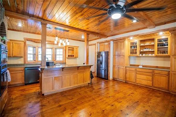 Welcome to your dream country retreat-perfect for a hobby farm-tucked back behind the trees on 5 acres. This stunning property offers space & family-friendly amenities, outside city limits but minutes from town. Outside, you will enjoy access to a fully stocked 7-acre lake, shared with only 3 neighboring properties-ideal for fishing or relaxing. The backyard features a semi-inground pool & splash pad, hot tub and outdoor movie screen. A 40' x 44' barn with lean-to offers ideal storage or workspace. Inside this rustic home is a large kitchen, dining, & hearth room with a wood burning stove featuring beautiful hardwood floors & a tongue & groove ceiling. With 4 large bedrooms, a bonus room (could be a 5th), & a dedicated office, this home has lots of space. Designed with storage in mind, it offers plenty of closet space, a large laundry/mud room, & a roomy closet in the living room that leads to a storm cellar. Reference MLS #1342067, MLS #1342059. Showings will be available starting April 16th-schedule yours soon!