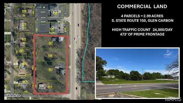 DREAM IT... DEVELOP IT... BUILD IT... Let the possibilities & ideas fly with this 2.99 acre lot nestled along S. State Route 159 in Glen Carbon with 473' of frontage. High traffic daily count of +24,000. HIGH VISIBILITY, & GREAT LOCATION; approximately 700 yards to Glen Carbon Walmart and shopping center and within a half mile to interstate I-270. A corner lot with great visibility for future business It's rare to find 2.99 acres on S. State Route 159, but now is your chance to own it! 4 prime parcels complete the total acreage offered (seller will not divide parcels for the sale). This commercial opportunity awaits- call today to inquire further! Location: High Traffic