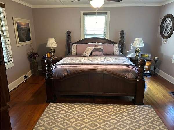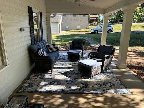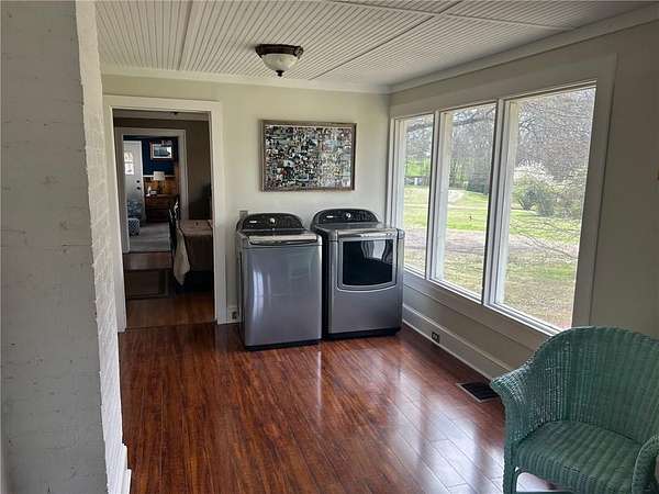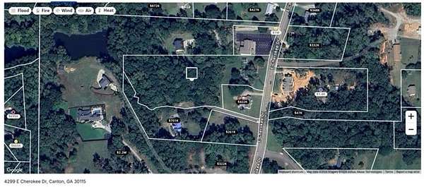 This home and property is a rare, only one of its kind combination and is located exactly one mile north of sought-after Hickory Flat. The property totals 4.5 acres, has large front and back yards and 3.5 acres of level terrain with hardwood trees backing up to a lake. The property is private with no immediate neighbors; nearby homes are valued at $1M+. There are 170 feet of street frontage on E. Cherokee. The front yard features a covered porch that measures 340 square feet, a horseshoe driveway, and a detached garage and storage room. The home was last remodeled in 2016 and has many vintage qualities of the era...hardwood floors throughout, arched door frames, glass doorknobs, wide window and base trim, wrought iron floor registers and others. The house is well-lit with three windows in every room. New A/C and furnace, with a 10-year service warranty, were installed in 2025. This area of Canton, just west of Milton and Alpharetta, is a relaxed community with scenic countryside of horse farms and meadows - which you have to see to appreciate!