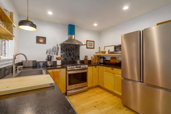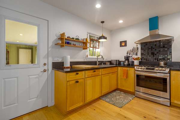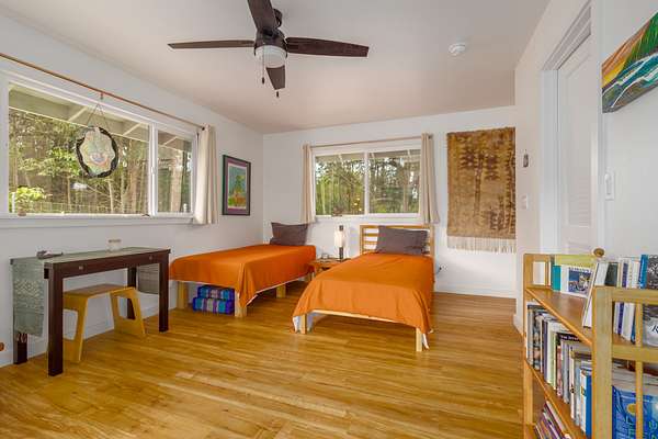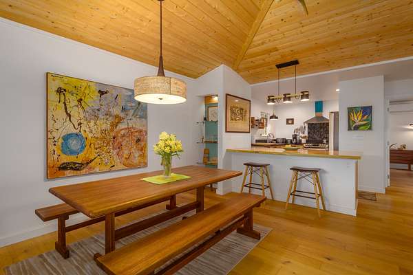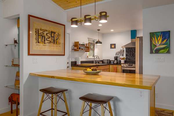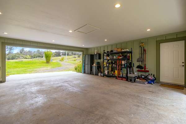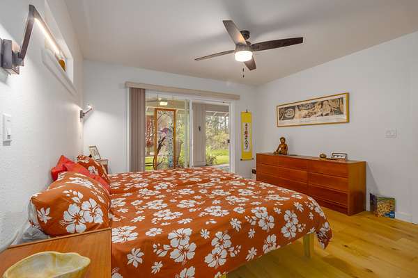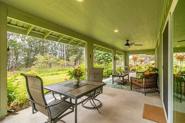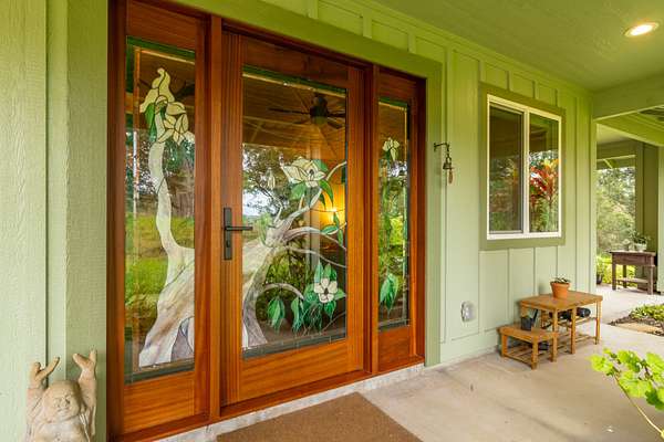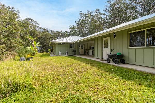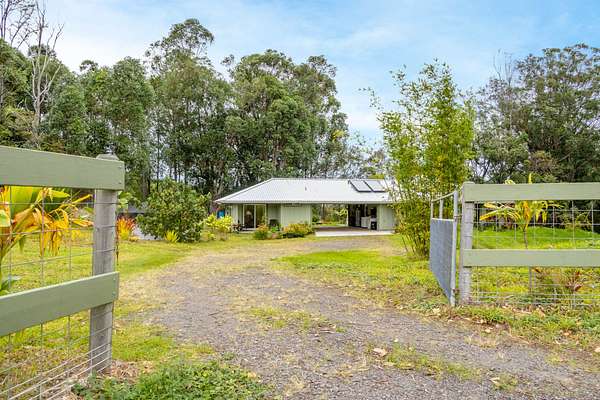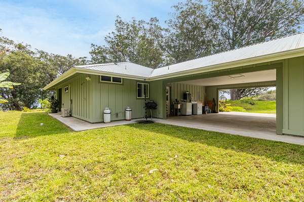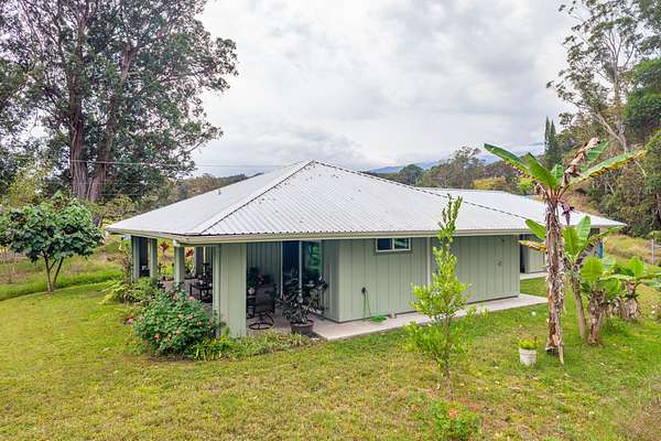 Enjoy upcountry living in this fully furnished 2-bedroom 2 bath home built in 2021, perfectly placed on 5 interesting acres. Open concept living area features custom wood vaulted ceilings, engineered hardwood flooring, Sugi pine TV table top, 12-foot slider that opens onto the spacious covered lanai, and stunning southern magnolia-stained glass entry door with matching sidelights. Kitchen/dining area features Mediterranean Cypress breakfast island, granite countertops, solid maple cabinets, some with pull out drawers, LP appliances including gas range with electric oven and range hood, deep stainless-steel sink, handy pantry and custom cypress/maple shelving in all the right places. Solid hard wood dining table, chandelier and glass shelving nook complete this space. Hall bath has ceramic tile flooring and walk-in shower, custom Norfolk pine vanity with vessel sink and open shelving. 1 of 2 bedrooms including a large walk-in closet, split wall unit and slider to the lanai can be found on this wing. Step out from the bedroom onto the front lanai and continue around the home in either direction with covered sidewalks leading to the covered carport. 2nd bedroom suite located off the carport features luxury vinyl plank flooring, walk-in closet and covered lanai. Suite and bath were designed to age in place and feature ceramic tiled flooring and walk-in shower, plus granite vanity top with vessel sink and open-air shelving. Parcel is fenced on 3 sides leaving the back portion across from the gulch open for grazing by neighboring cattle. East side near the road includes completely fenced paddock previously used for goats and a green house. 8 X 20 storage container with gasketed doors will stay with home. Other property features include a large carport, underground electric to the home, water catchment with UV water filtration system, engineered septic system, solar water heating system with 80-gallon tank and two panels.