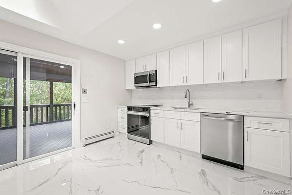 Settle in for Spring ready to immerse your Summer in this exceptional Split-Level Gem featuring Privacy, Serenity & Space nestled within Private community, Points of View, conceptionalized and developed by Legendary Architect, frazier Peters! Welcome home to this beautifully maintained 4 bedrooms, 2.5 bath split-level residence in perfect move-in ready condition. Set on 1.5 acres of private grounds, this home offers the perfect blend of style, comfort with outdoor living/relaxation. Entrance Foyer invites you to spacious Living Room, lovely hard wood floors, Dining area, beautiful kitchen with skylight, quartz counter tops, stainless steel appliances, sliding glass doors to large deck. The spacious primary suite features its own full bathroom and private deck, creating a true retreat. Multiple oversized decks on both the main and lower levels make entertaining effortless while enjoying serene views of nature. The inviting family room with fireplace opens to its own deck, ideal for gatherings year-round. A large driveway and two-car garage provide convenience and plenty of parking. This home has the perfect balance of style and practicality. Approx. 10 minutes and you are in the village of Warwick where you find easy enjoyment of shopping, restaurants, farmers markets, winery, and the likes.