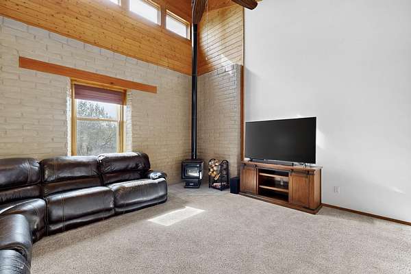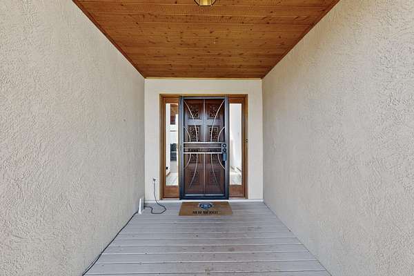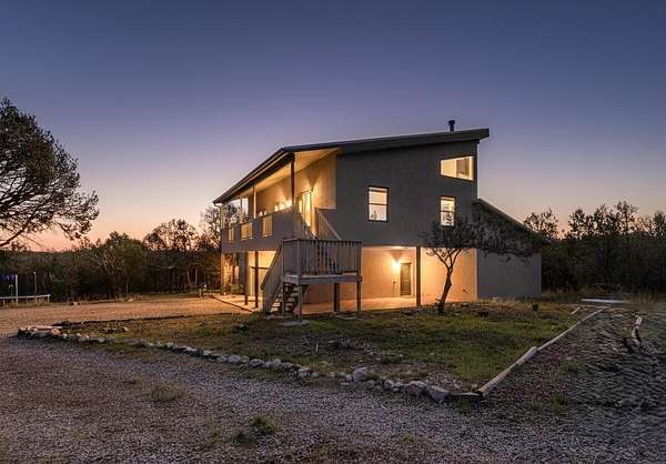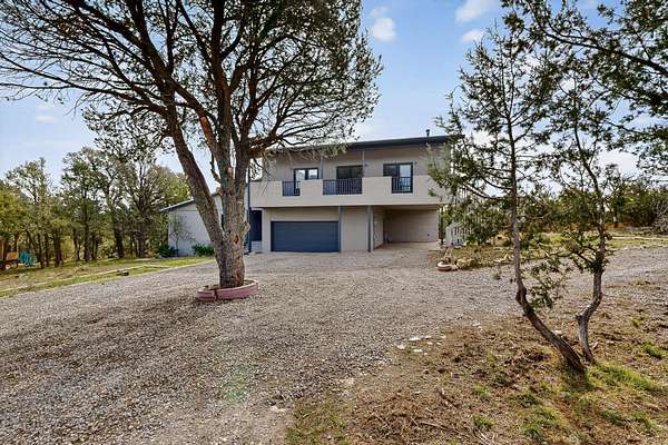 Modern Southwest-style home on nearly 4 private wooded acres, just 15 minutes to ABQ. Spacious and full of charm, featuring an open main living area with a large kitchen boasting tons of counterspace and stainless appliances, vaulted T&G ceilings, passive solar trombe walls, and a deck off the dining area. The main-level primary suite includes a private deck with hot tub, trombe walls, huge walk in closet, private bath with soaking tub and separate vanities. Upstairs, a 1,000 sq ft loft/flex space with a full bath and large deck offers endless options--ideal for a guest suite, home office, or rental. Located in the San Antonito school district with horse-friendly zoning, outdoor workshop space, garden beds, metal roof, fully fenced & gated, and an assumable VA loan.