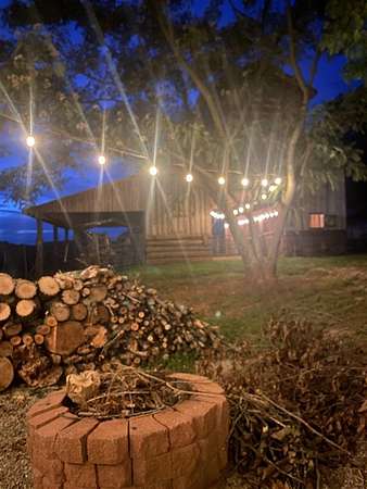 - Barn, Covered Front Porch, Fence, Garden Area, Landscaping, Line Fence, Out Building, Stables, Storage Building, Trees, Woven Wire