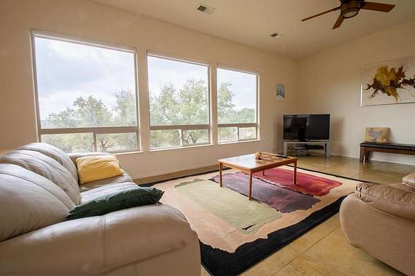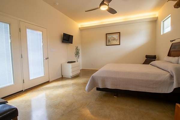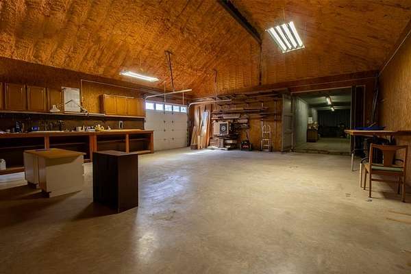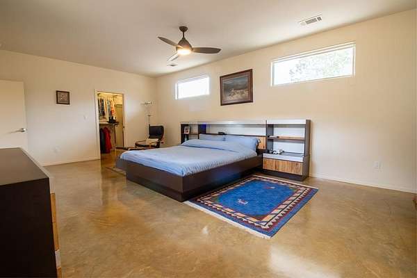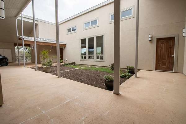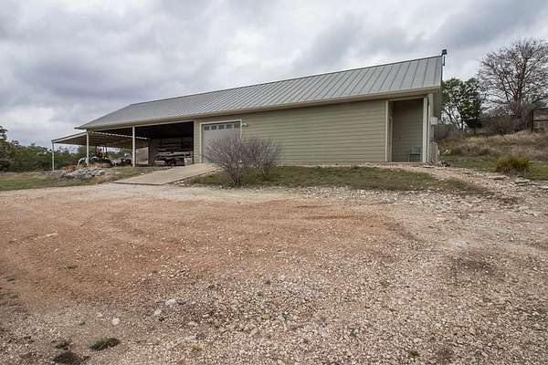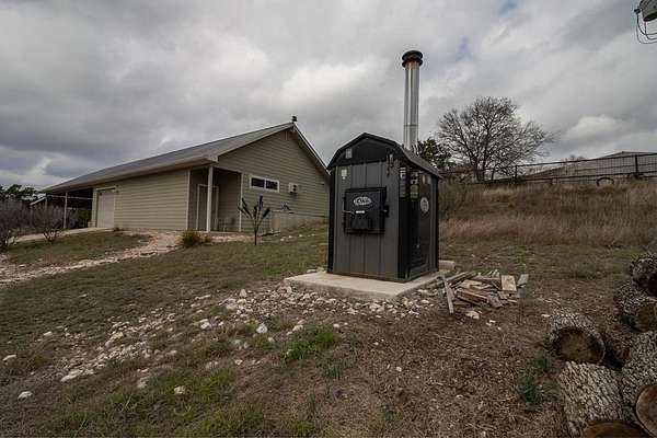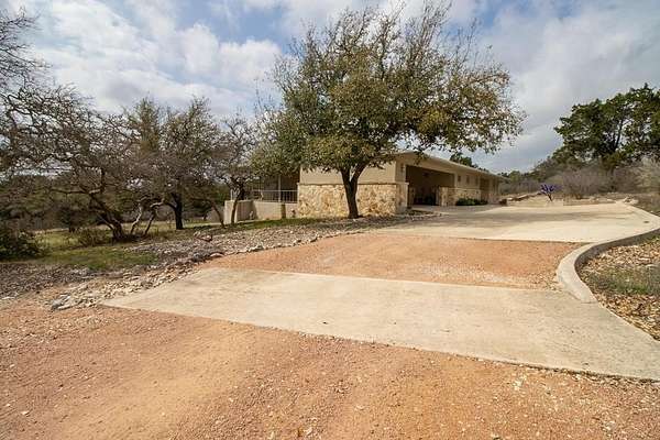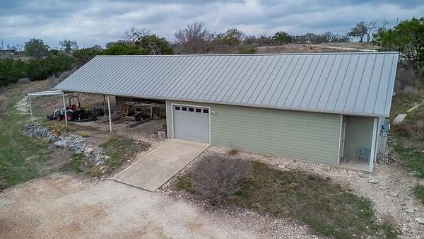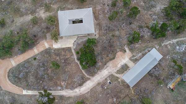 Discover the perfect blend of modern comfort & Texas Hill Country with this unique contemporary home, barn, & high fenced, Ag Exempt 28+ acres. The home is designed with clean, architectural lines, soaring ceilings & expansive windows that bring the natural light & outdoor views in. The spacious bedrooms provide generous closet space. A 2nd bedroom guest suite, has access from the courtyard, and has its own HVAC system. A dedicated office could be the 3rd bedroom. No curbs in the showers....wheelchair accessible! Climate comfort is ensured with a standard HVAC system enhanced by an additional outdoor wood fired boiler that heats both the house and workshop. The average monthly electric bill for 2025 is around $98! The large workshop is heavily insulated, air conditioned, has a 1 ton hoist on sliding Trolley and has a bedroom/bath for guests. Extra storage is provided by 40 ft container which is attached to the workshop. The workshop also provides cover for parking implements and trailers. The water well has a 3000 gallon storage tank and the well house roof is removable. R/O lines run from the well to the house. Check out all the extras on the attached Features Page!