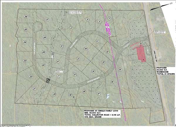 Presenting a rare 64+- acre development opportunity offering both industrial and residential potential in one contiguous site. The front 400 feet of the property are zoned IND-1, allowing for commercial or light manufacturing uses, while the remaining acreage is zoned Rural Residential, ideal for a new housing subdivision or estate lots. Preliminary concept plans prepared by a local engineering firm indicate the site could support a 20,000+- SF industrial building at the front portion, along with approximately 30 single-family homes throughout the balance of the property (subject to approvals). This property offers a highly flexible layout, allowing developers, investors, or end users to pursue a range of uses -- from a mixed-use industrial/residential project to a standalone subdivision or business park. With significant frontage, strong zoning diversity, and large acreage, this site presents a unique opportunity to capture both commercial and residential demand in the area.