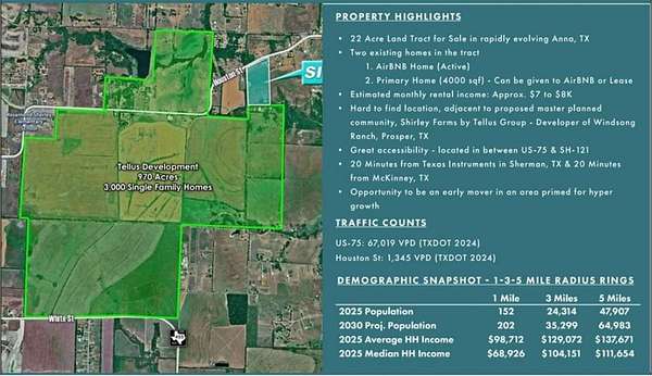 Exceptional opportunity to own approximately 21+ acres on FM 2862 in Anna. Ideally positioned adjacent to and sharing a boundary with the Sherley Farms master-planned community by Tellus Group. With Sherley Farms breaking ground on March 25, 2026, and the property located outside city limits (ETJ), the area is poised for significant residential growth—making this property an excellent candidate for investment, development, commercial, or long-term hold.