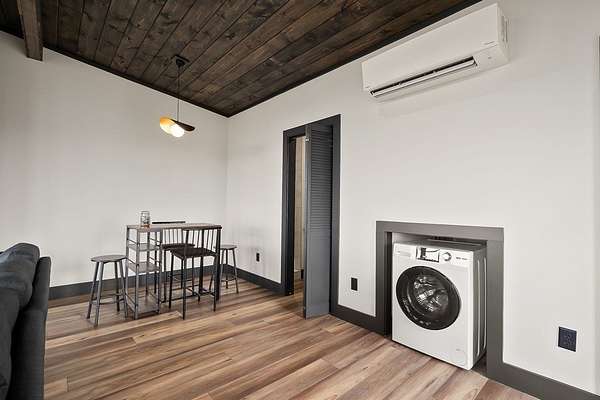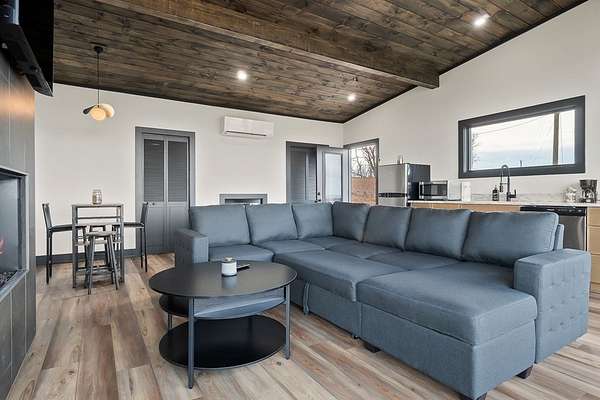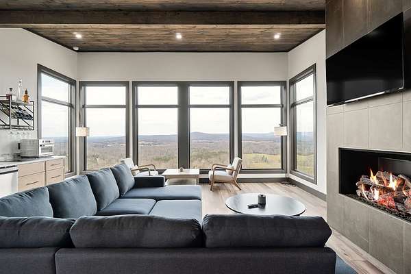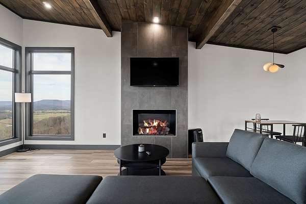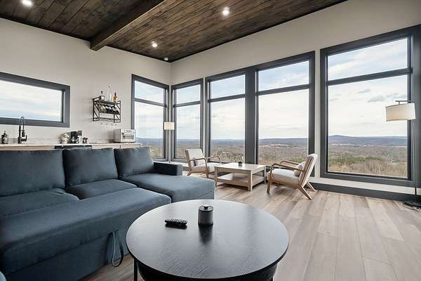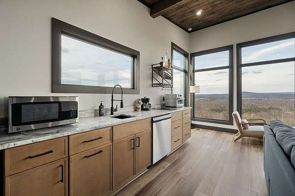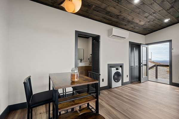 Discover the ultimate in modern living with this 600-square-foot open-concept studio, nestled on 15.8 acres of pristine land. Enjoy breathtaking mountain views through floor-to-ceiling glass on three sides, seamlessly blending the indoors with the natural surroundings. This property features riding trails and is close to a river and state parks, ideal for nature enthusiasts. Inside, indulge in a large tiled shower, a kitchen with a range, refrigerator, washer and dryer combo, and granite countertops. Cozy up by the gas fireplace in the fully furnished living area. Enjoy high-speed internet, making remote work or streaming a breeze. This property offers excellent potential as an Airbnb rental, a weekend getaway, or a private sanctuary. Experience privacy and endless outdoor adventure opportunities in this ultra-modern studio, combining luxurious amenities with natural beauty.