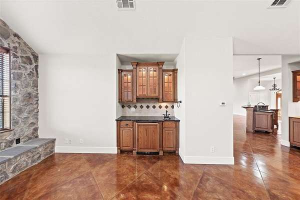 - Built-In Features, Chandelier, Decorative Lighting, Eat-In Kitchen, Granite Counters, Kitchen Island, Natural Woodwork, Open Floorplan, Vaulted Ceiling(s), Walk-In Closet(s), Wet Bar