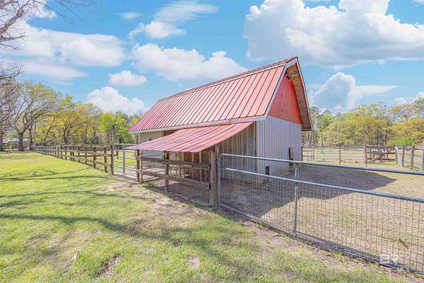 - Automatic Garage Door, Barn, Ceiling Fan(s), Covered Patio, Cross Fenced, En-Suite, Fenced, Guest House, Porch-Back, Split Bedroom Plan, Stables, Storage Building, Termite Contract
