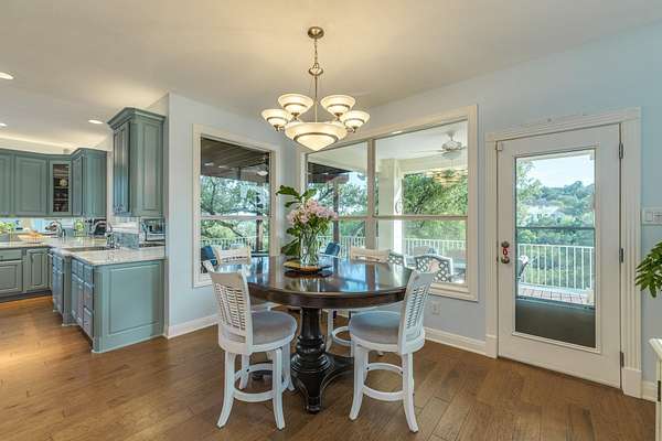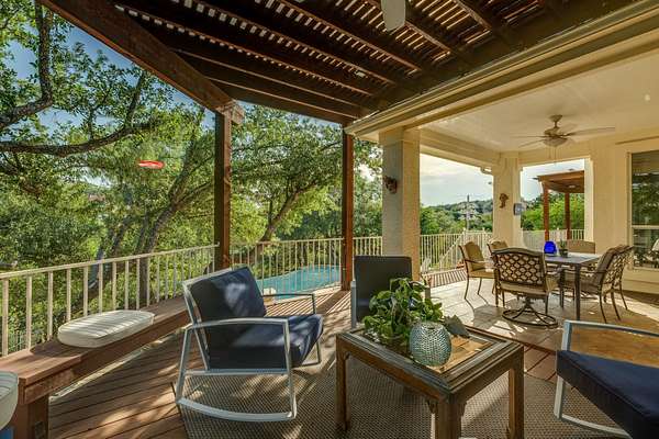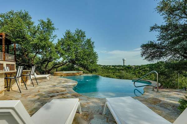 Fully remodeled and meticulously maintained home nestled in the exclusive Gated Lakewind Estates. This home is a blend of elegant sophistication & unparalleled comfort. 4,627 SF per FPG. Exceptional attention to detail & style, this property exemplifies the essence of Hill Country living. As you enter, the Grand foyer w/ graceful winding staircase welcomes you into the home. En-suite bedroom on main level with access to back deck. Wood flooring & beautiful plantation shutters create a warm inviting ambience. The heart of the home is the Great room w/soaring ceilings & wall of windows which provide abundant natural light complemented by a fireplace. Spacious Dining room ideal for family gatherings or entertaining. A service pantry with built-ins and ample cabinetry caters to your hosting needs. Retreat to the living room for conversation or just to unwind. Chef-inspired Kitchen is a culinary dream, boasting luxurious quartz countertops, large center island w/ propane cooktop, under cabinet lighting & recent appliances. Step outside to large covered deck, an ideal outdoor oasis for dining al fresco or enjoying Hill Country views. Bedroom/Office on main level also has access to outdoor deck. Primary bedroom suite has sitting area and dedicated office. Opulent dressing area w/ oversized closets. Primary bath is a spa-like retreat w/ heated travertine floors, soaking tub & exquisite tile details. 3 addit'l bedrooms on second floor include large en-suite bedroom & 2 bedrooms that offer comfortable space for family or guests. Discover the backyard oasis complete w/ a sparkling pool & spa, numerous patios & spacious deck areas. Endless entertainment options w/ outdoor kitchen equipped w/griddle, ice maker, refrigerator & large granite countertop for poolside dining. Property illuminates beautifully at night w/ landscape lighting. Solar panels & lightning rod system. Washer/Dryer & Refrigerator convey. Close to Lakeway & Four Points shopping & restaurants. Lake Travis ISD