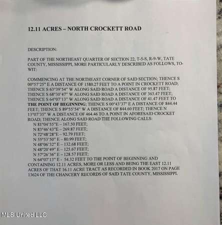 PART OF THE NORTHEAST QUARTER OF SECTION 22, T-5-S, R-9-W, TATE COUNTY, MISSISSIPPI, MORE PARTICULARLY DESCRIBED AS FOLLOWS, TO-WIT: COMMENCING AT THE NORTHEAST CORNER OF SAID SECTION; THENCE S 00 degrees 57'25 E A DISTANCE OF 1580.27 FEET TO A POINT IN CROCKETT ROAD; THENCE S 63 degrees 39'54'' W ALONG SAID ROAD A DISTANCE OF 95.87 FEET: THENCE S 68 degrees 30'47'' W ALONG SAID ROAD A DISTANCE OF 363.47 FEET; THENCE S 64 degrees 07 13'' W ALONG SAID ROAD A DISTANCE OF 41.47 FEET TO THE POINT OF BEGINNING; THENCE S 00 degrees 43'37'' E A DISTANCE OF 844.44 FEET; THENCE S 89 degrees 55'54* W A DISTANCE OF 844.60 FEET; THENCE N 13 degrees 07'35* W A DISTANCE OF 464.46 TO A POINT IN AFORESAID CROCKET ROAD; THENCE ALONG SAID ROAD THE FOLLOWING CALLS: N 81 degrees 04'55*E - 167.50 FEET; N 83 degrees 46'43''E - 269.87 FEET; N 72 degrees 48 28''E - 92.79 FEET; N 55 degrees 53'50* E - 80.99 FEET: N 48 degrees 06'32'' E - 132.68 FEET: N 48 degrees 20'49'' E - 125.67 FEET; N 57 degrees 26'36'' E - 128.57 FEET: N 64 degrees 07 13'' E - 54.32 FEET TO THE POINT OF BEGINNING AND CONTAINING 12.11 ACRES, MORE OR LESS AND BEING THE EAST 12.11 ACRES OF THAT 16.11 ACRE TRACT AS RECORDED IN BOOK 2017 ON PAGE 13624 OF THE CHANCERY RECORDS OF SAID TATE COUNTY, MISSISSIPPI.