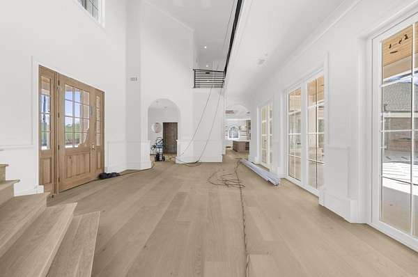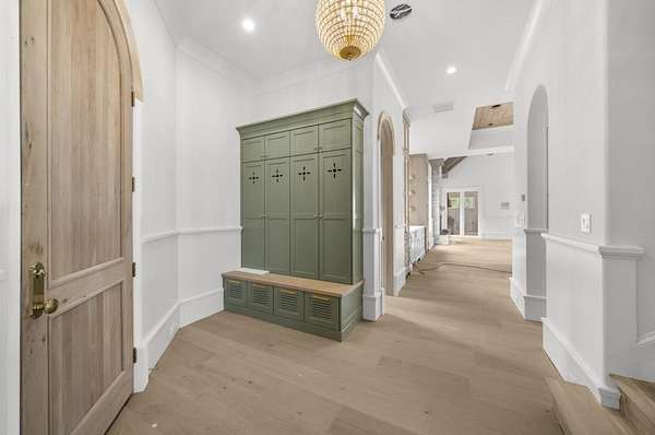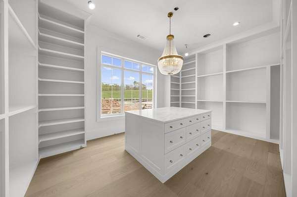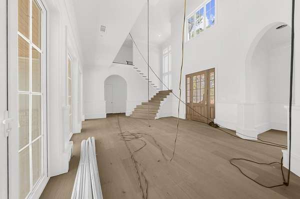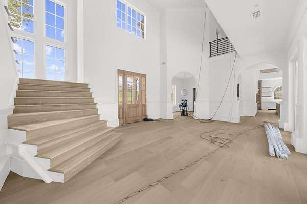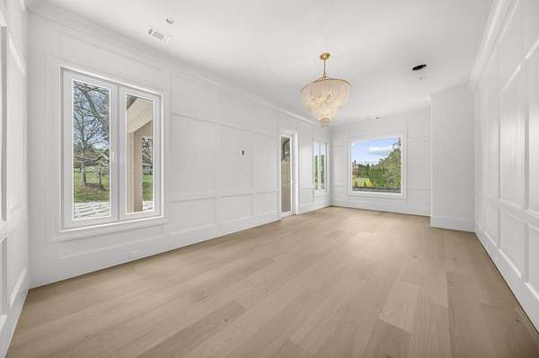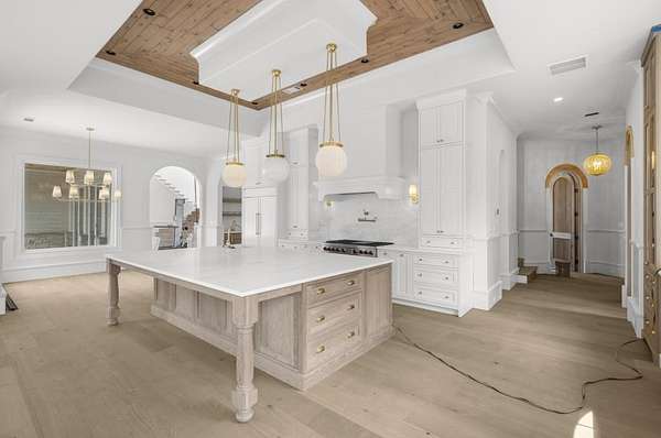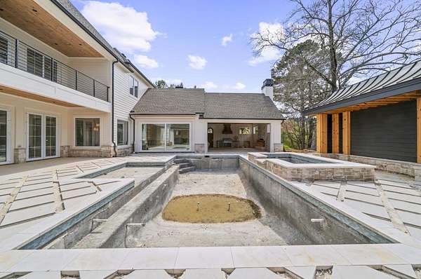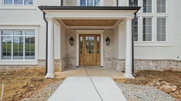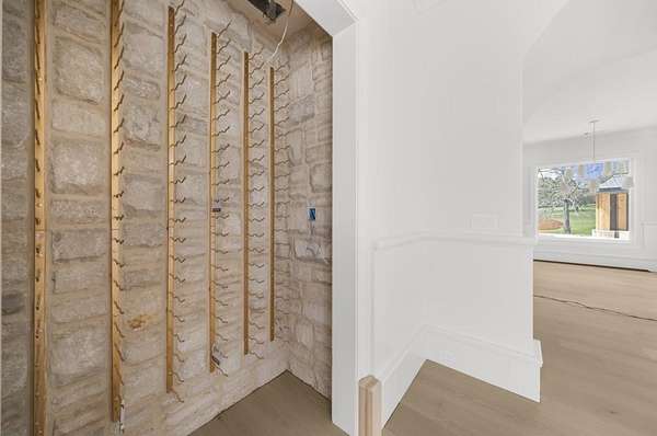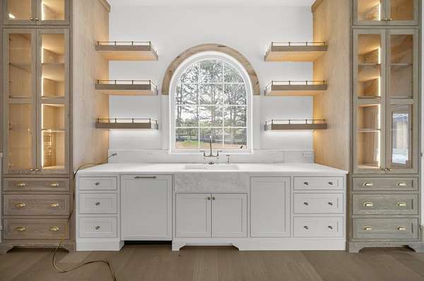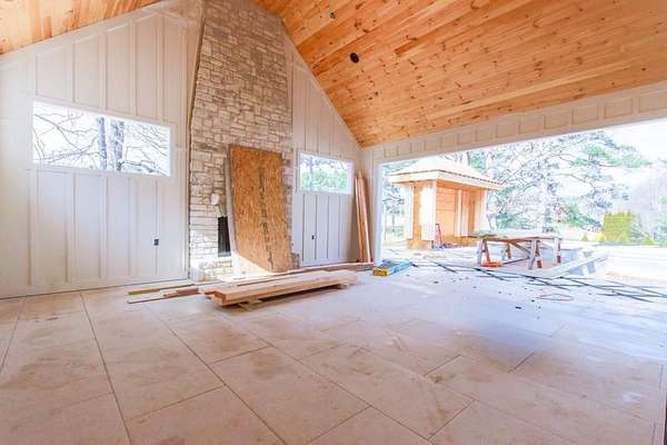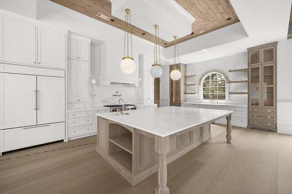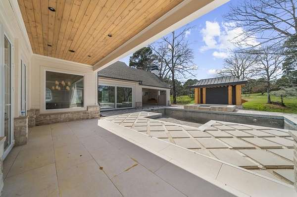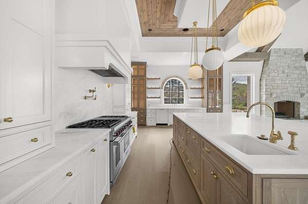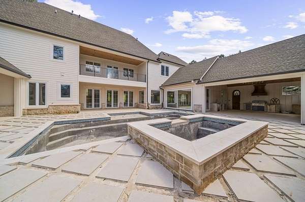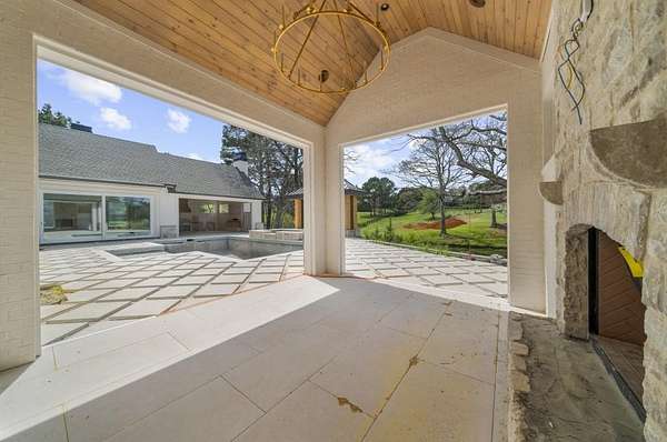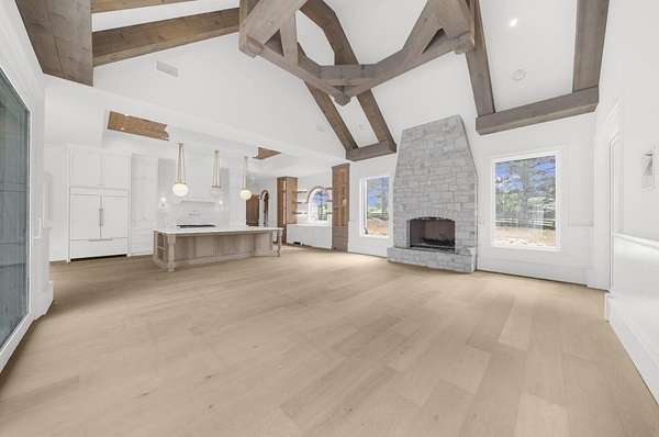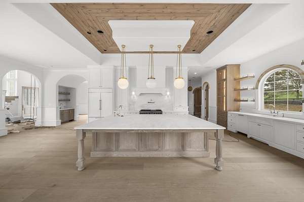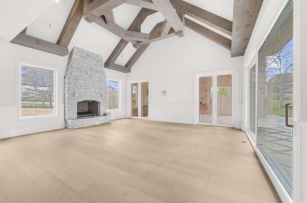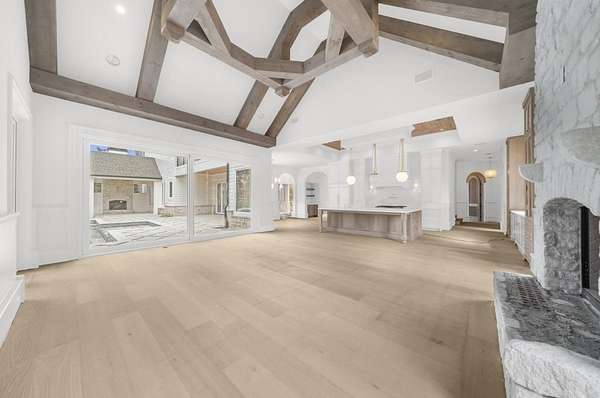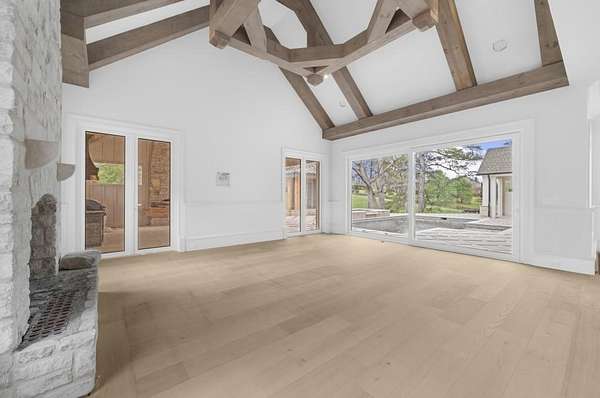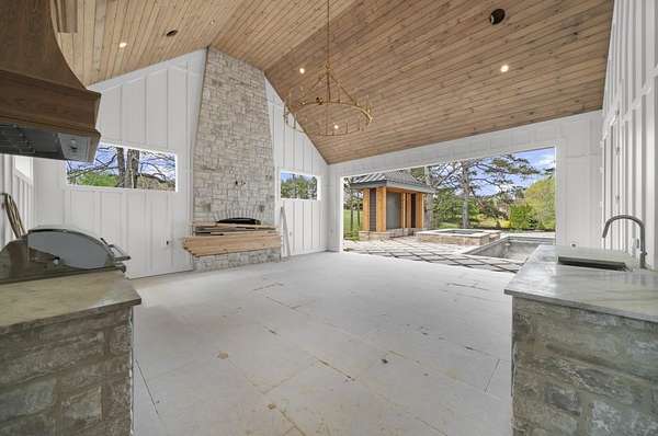 Stunning stone & brick new construction perfectly situated on 2 acres custom built by Savage Family Homes! The grand entry welcomes you with soaring 25-foot ceilings, a dramatic window-wall staircase and elegant arched doorways throughout the main level. Engineered wide-plank white oak floors, fluted white oak custom doors, and exposed beams in the vaulted family room create warmth and architectural interest. The family room is anchored by a stunning Indiana limestone fireplace. The chef's kitchen is a true showpiece with custom inset white oak cabinetry, marble countertops, herringbone wood-paneled ceiling and a center island with garden sink. A full suite of Sub-Zero and Wolf appliances is complemented by a fully equipped scullery featuring a steam oven, standard oven, warming drawer, second dishwasher and extensive storage. Entertain effortlessly in your formal dining room with wet bar and glass-enclosed wine display set against a striking stone feature wall. The private owner's suite on main is a serene retreat with a separate sitting area, private covered porch with gas fireplace and tranquil water views. The spa-inspired bath features his-and-her vanities, an arched frameless glass shower with dual shower heads, designer tile arched niches and a massive custom closet complete with ample hanging space, shoe display, handbag display and center island. This Outdoor living area rivals a luxury resort with a covered pool cabana featuring tongue-and-groove ceilings, Indiana limestone fireplace, pool bath, grill station with griddle, under-counter refrigerator and full wet bar. The 17x34 saltwater pebble pool with raised spa is surrounded by turf-inlay decking and a custom movie pavilion, creating the ultimate entertaining environment. The secondary level offers four spacious en-suite bedrooms, including one with a Juliette balcony overlooking the water, a dedicated study and a large unfinished space ready to be finished as a media room, loft, or home office. A rare opportunity to own a masterfully designed property offering privacy, luxury, and breathtaking views.