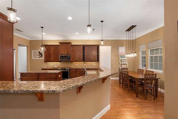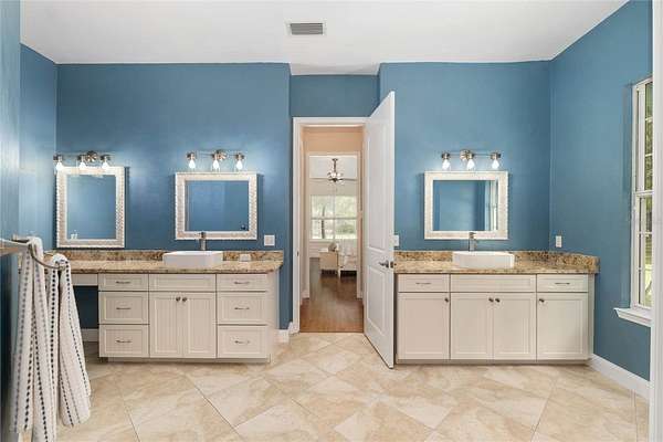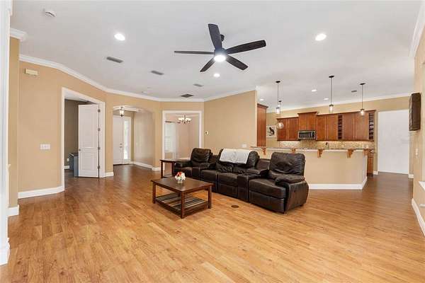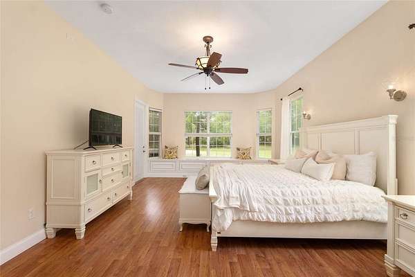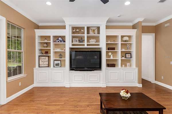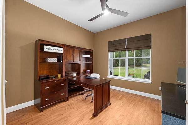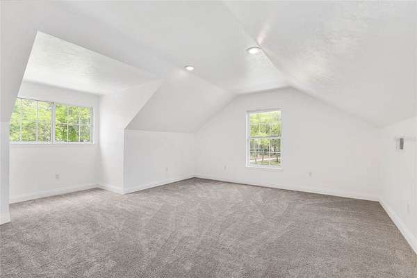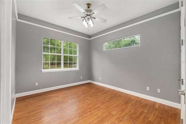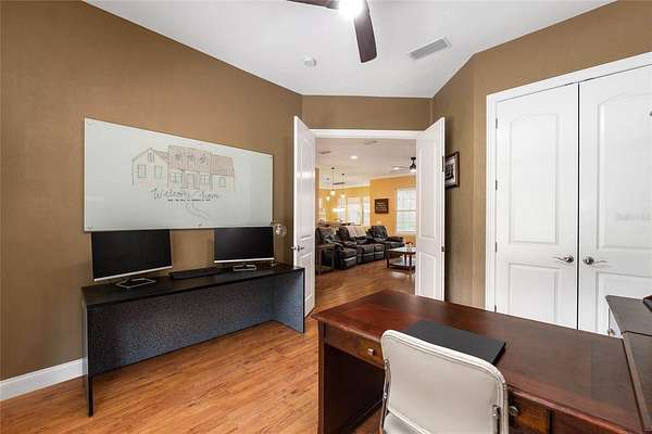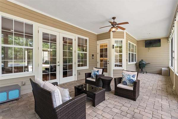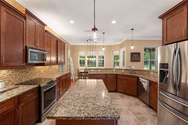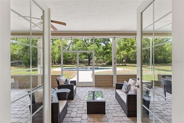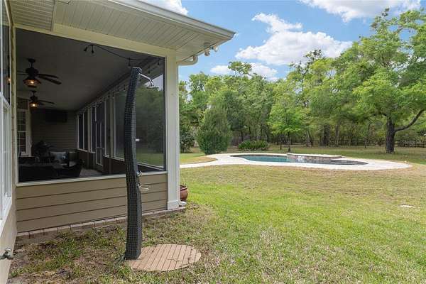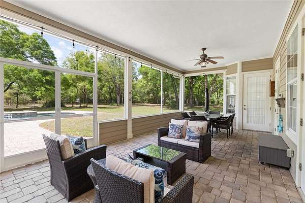 As you pull through the gates, you immediately feel the difference. There’s space here. Not just in the size of the lot, but in the way the property lives. It feels open, yet private, and just far enough removed without giving up convenience. The winding drive leads through a canopy of trees to this beautifully positioned home on 5.33 acres in the gated, horse-friendly community of The Trails. This 4BR, 3BA home with bonus room offers a strong combination of functionality, flexibility, and privacy. Inside, you’ll find an open layout with 12' ceilings, 10' doors, and natural light throughout the main living areas. The living room features custom built-ins and French doors leading to the screened lanai and pool. The kitchen is open to the main space and connected to both the breakfast nook and dining area, with stainless appliances, abundant cabinetry, generous counter space, center island, walk-in pantry, bar seating, and a gas line stubbed behind the range. The breakfast nook overlooks the pool, and the dining room near the entry offers flexibility depending on how you live. The 4th bedroom is currently used as an office just off the main living area. The split bedroom plan provides privacy, with a spacious primary suite featuring multiple windows, a window seat with storage, dual vanities, soaking tub, large walk-in shower with dual heads, and two walk-in closets. Two guest bedrooms share a Jack and Jill bath with private vanity areas, and a separate pool bath offers direct lanai access. Just off the garage entry is a drop zone with built-ins, along with a laundry room offering counter space, cabinetry, and a utility sink, plus additional storage under the stairs. Upstairs, the bonus room over the garage provides a large, flexible space for a variety of uses. The attached 3-car garage includes high ceilings, dual doors, and a hidden lockable storage or safe room. The screened lanai with paver flooring creates a true outdoor living space with room for both lounging and dining, and a gas line is already in place for a future outdoor kitchen. The saltwater pool features a raised water element, expansive paver deck, and pool fence. A detached 2-car garage offers additional workspace and storage with attic access above, along with an attached carport. A separate 24'x24' covered carport provides even more space for vehicles, trailers, or equipment. The property itself offers a mix of cleared yard and mature trees, with a gate providing direct access to the community horse trail. Additional features include central vacuum, generator wiring, a 250# propane tank, 2020 Trane HVAC, 2023 roof, and 2023 well bladder tank, all serviced by Clay Electric. Located just minutes to Publix and everyday conveniences with an easy drive into Gainesville, UF, and Shands, this property offers space, flexibility, and a setting that’s hard to replicate.