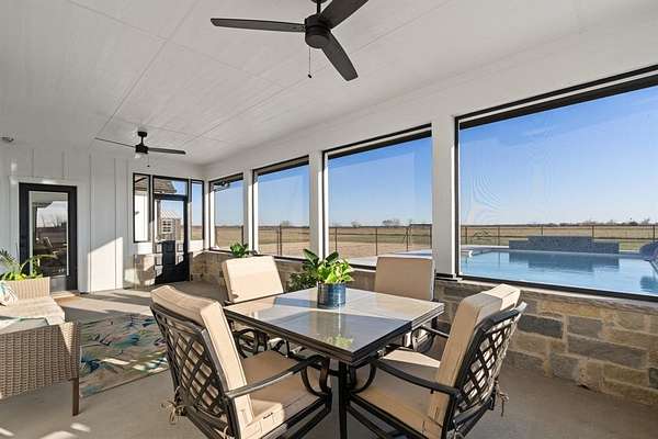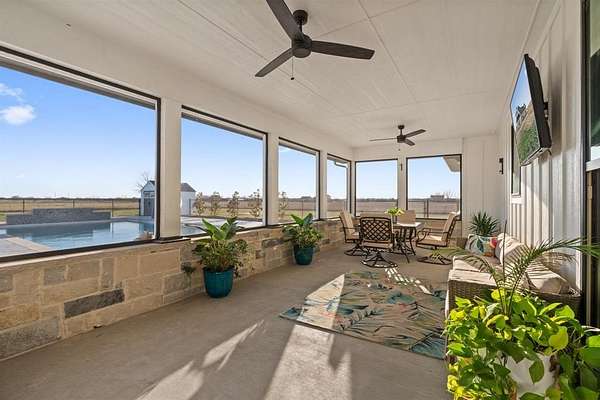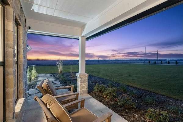 A cozy sunroom overlooking the backyard is perfect for morning coffee, while the expansive front porch offers beautiful Texas sunset views.