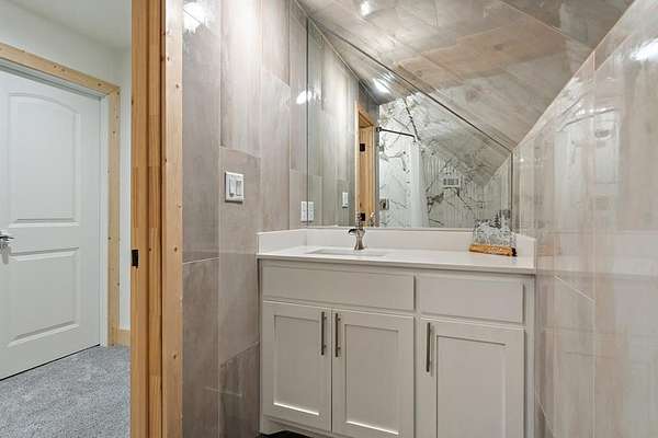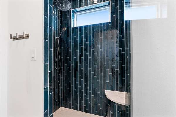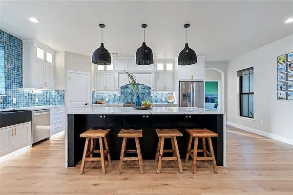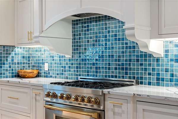 The chef’s kitchen includes premium appliances, an oversized island, soft-close cabinetry, and a striking coastal-style backsplash. Large windows throughout the home bring in natural light and showcase the peaceful views of the surrounding land.