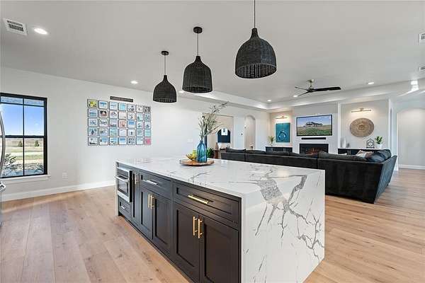 The custom home features 4 bedrooms, 3 bathrooms, a dedicated office, bonus room, and over 3,600 sq ft of living space designed for both comfort and entertaining. Inside you’ll find wide-plank flooring, designer lighting, and an open-concept layout connecting the living room, dining area, and kitchen.