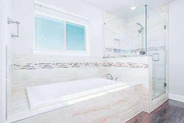 A chandelier accents the dining area, which includes custom built-in display cabinets, drawers, and a wine rack. All bedrooms offer walk-in closets with built-in shelving. The private primary suite features vaulted ceilings and a spacious bath with dual sinks, a jetted soaking tub, and a large glass-and-tile walk-in shower.
