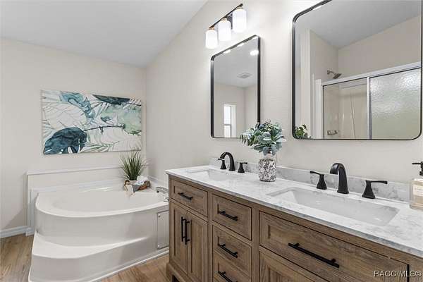 - Bathtub, Breakfast Bar, Dual Sinks, Open Floorplan, Pantry, Primary Suite, Separate Shower, Sliding Glass Doors, Split Bedrooms, Stone Counters, Tub Shower, Updated Kitchen, Walk In Closets, Window Treatments, Wood Cabinets