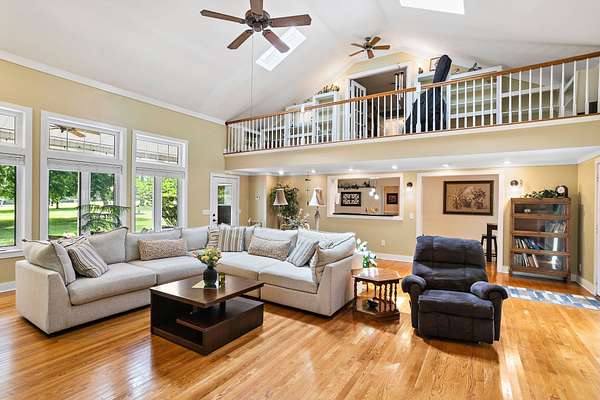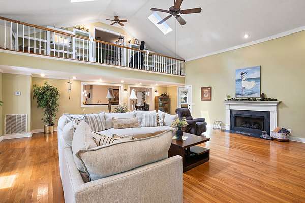 Interior features include two gas-log fireplaces, a vaulted great room, skylights providing abundant natural light, hardwood floors, and tiled bathrooms. The kitchen has been updated with new quartz countertops, combining style and durability.