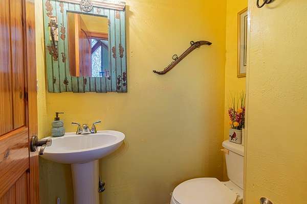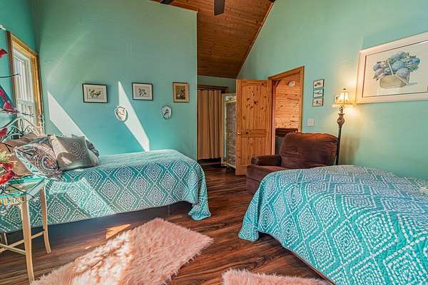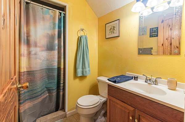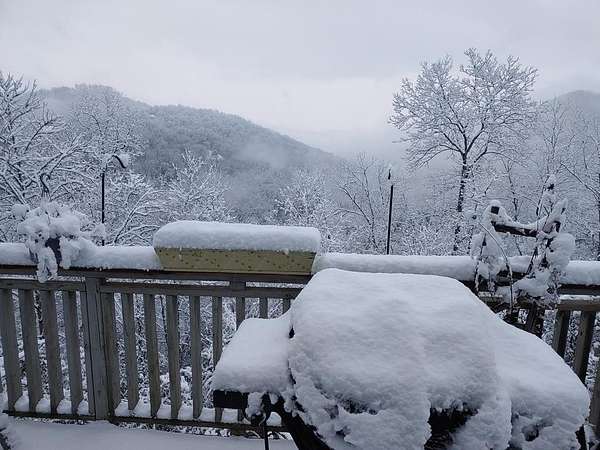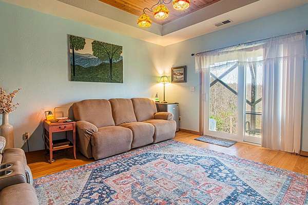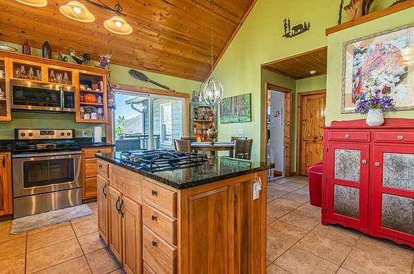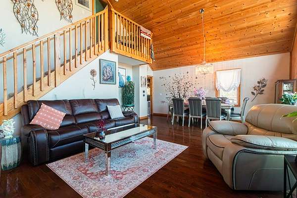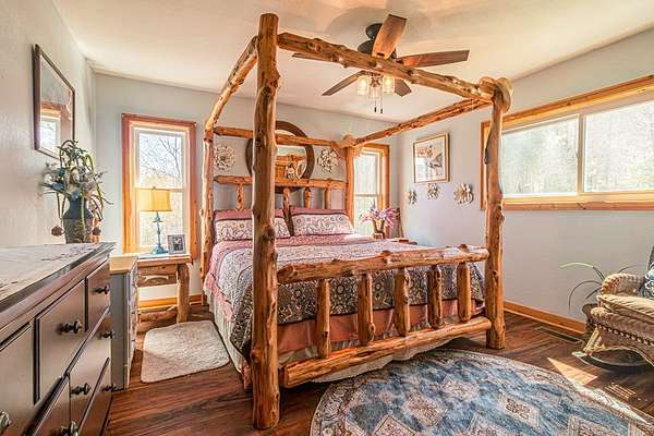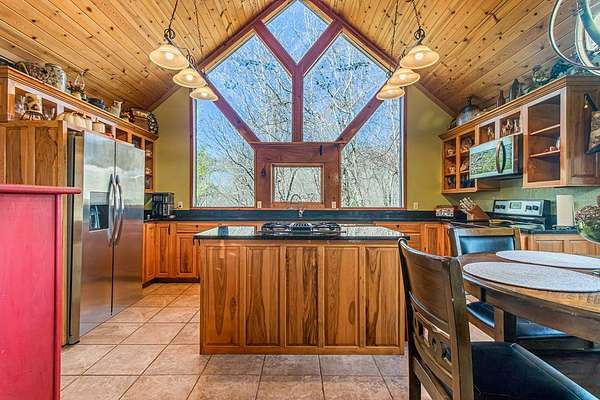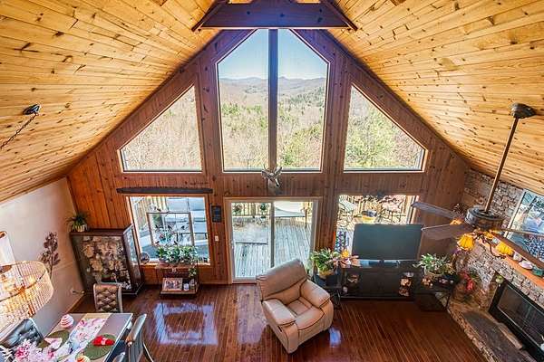 Set among the ridgelines, this timber frame home is a custom built retreat where rustic character and long-range mountain views take center stage. Tongue-and-groove vaulted cathedral ceilings soar throughout, anchored by a magnificent stacked stone fireplace with gas logs in the palatial great room. Step outside onto 600 feet of deck to soak in sweeping valley and mountain views, with hiking trails right from your back door. The chef's kitchen features custom hickory cabinetry, granite countertops, and a sunny breakfast nook. A bedroom and full bath on each level make this home ideal a large family or a vacation rental. Two master suites offer private baths, and the above-ground walk-out basement adds a third bedroom, full bath, den, laundry, and generous storage. The home has been meticulously prepared: HVAC new in 2021, appliances replaced within four years, new Anderson windows, and recently completed electrical, plumbing, and HVAC inspections. With an acceptable offer, the buyer selects the exterior color for the home and decks, covered from seller proceeds. The seller is a licensed real estate agent and the owner of the home.