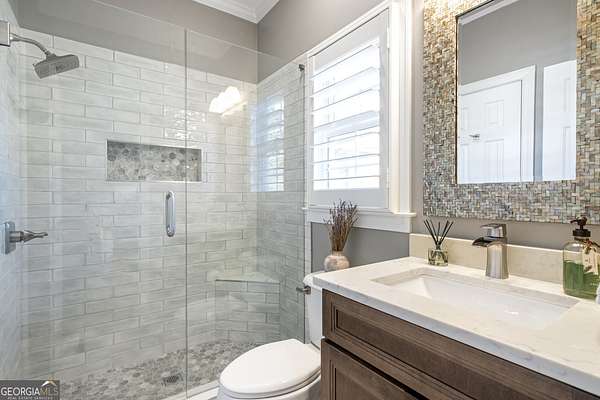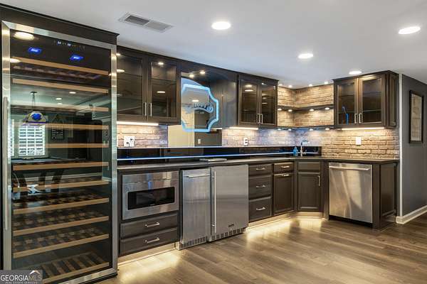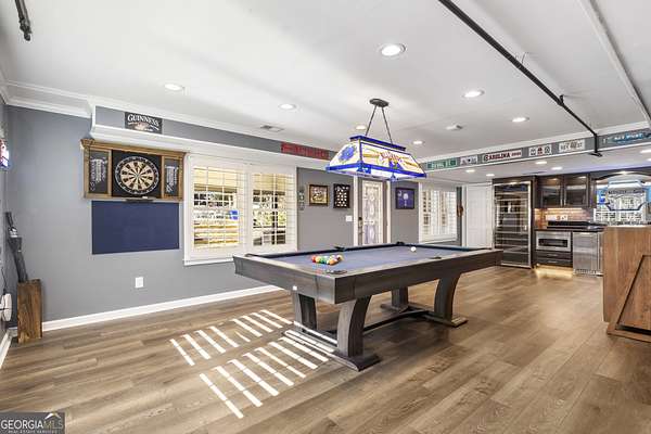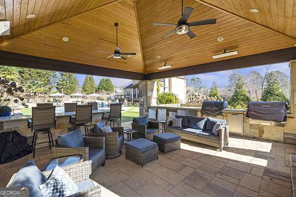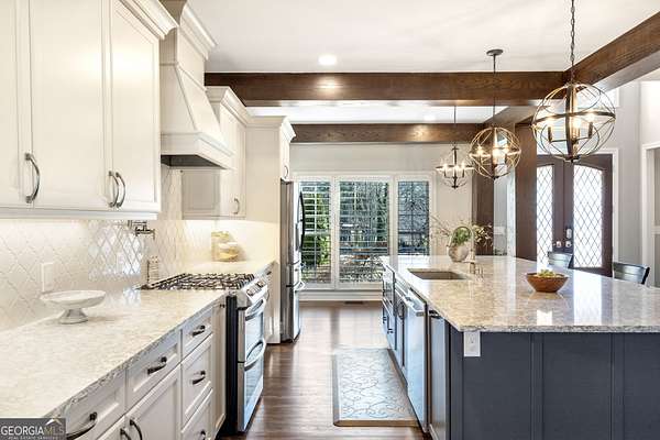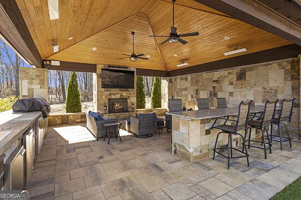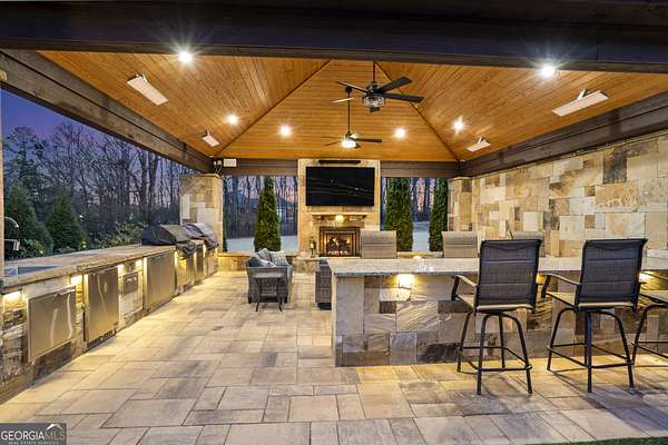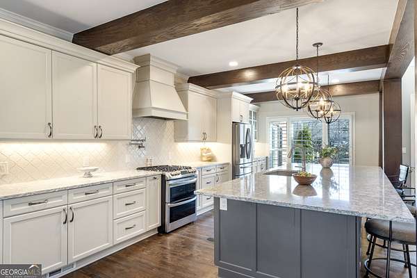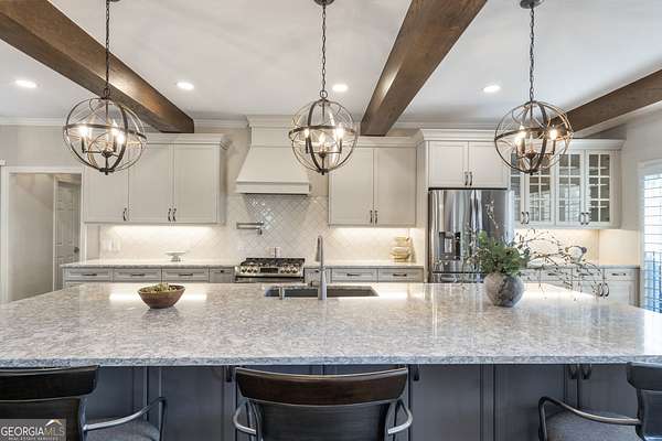 This exceptional residence is a true statement home, where nearly $1 million in thoughtful, high-quality improvements has redefined every detail. This isn't a renovation-it's a transformation, delivering a private, resort-style retreat designed for elevated everyday living and effortless entertaining. You'll never need to leave on vacation again because vacation is in your backyard. One of the special redesigns of the home is a fully custom chef's kitchen, blending refined design with exceptional functionality. Brand-new custom cabinetry with soft-close doors and drawers is thoughtfully outfitted with pull-out drawers, utensil storage, spice racks, and double pull-out waste receptacles. An oversized quartz island with built-in storage anchors the space beneath exposed architectural beams, creating a striking yet warm focal point. Premium finishes include a Blanco sink, nickel-finished faucet and pot filler, a true vented hood to the exterior, under-cabinet lighting, and glass-front display cabinetry. High-end appliances include a Bosch dishwasher, a sleek microwave drawer, and additional new appliances completing this chef-caliber space. All-new designer lighting throughout the kitchen enhances both form and function. Beyond the kitchen, the home continues to impress with new hardwood flooring, plantation shutters, upgraded bathrooms with heated floors, and a custom primary closet system, all reflecting meticulous craftsmanship and attention to detail. The outdoor living experience rivals a luxury resort. A custom stone pavilion with gas fireplace, professionally designed landscaping with waterfalls and flagstone, screened porch with automated shades, Trex deck, under-deck dry ceiling system with integrated lighting, heated pool, and two custom golf putting greens create an unparalleled backyard retreat. Additional enhancements include a fully finished basement with custom bar and bath, whole-home generator, upgraded HVAC systems, smart water shutoff system, 12-zone irrigation, and a reinforced, oversized concrete driveway with a basketball hoop. Every interior and exterior element has been elevated well beyond builder grade. This is not simply a home-it is a carefully curated lifestyle property where design, comfort, and long-term value converge. Opportunities with this level of investment already complete are exceptionally rare.