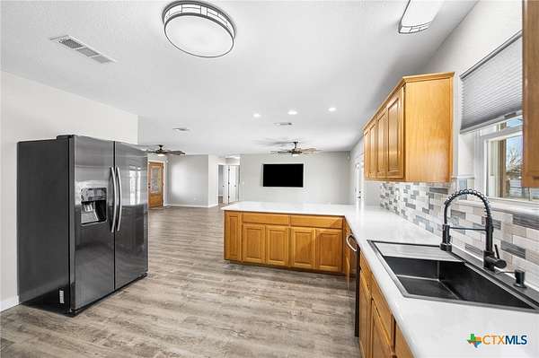 WELCOME TO YOUR VERY OWN SLICE OF HEAVEN. THIS MINI-RANCH HAS ALL YOU COULD EVER WANT. RESTORED AND UPDATED HOME THAT IS HANDICAP ACCESSIBLE, HUGE 40 X 40 WORKSHOP, RV GARAGE, ANIMAL BARN, FENCED AND CROSS FENCED AND NO HOA TO DEAL WITH. THE HOME HAS HAD EXTENSIVE REMODELING IN THE LAST 3 YEARS INCLUDING NEW HEAT/AC SYSTEM IN AND OUT, NEW WINDOWS, FLOORING AND REMODELED KITCHEN AND BATH.LUXURY VINYL PLANK FLOORING FOR BEAUTY, TOUGHNESS AND EASY CARE. QUARTZ COUNTERS THROUGHOUT THE HOME IN THE KITCHEN AND IN THE BATHROOMS. MAIN BEDROOM FEATURES WALK-IN SHOWER AND LARGE WALK-IN CLOSET. THE SECOND BEDROOM ALSO HAS A (HANDICAP SHOWER/WALK-IN TUB. 80 GALLON WATER HEATER INSTALLED SO YOU NEVER RUN OUT OF WATER EVEN WHEN FILLING THE TUB. FRENCH BACK DOOR INSTALLED TO ENJOY THE OUTDOORS. THE WORKSHOP/RV GARAGE HAS DRIVE THRU DOORS, TALL ENOUGH FOR EVEN THE BIG RIG OR BIG ENOUGH FOR 12 CARS. WITH NO RESTRICTIONS YOU CAN OPERATE YOUR BUSINESS FROM HERE, ENJOY ALL YOUR TOYS SUCH AS CARS, TRUCKS, OR DO YOUR WOOD WORKING PROJECTS OR ANY BUSINESS YOU WANT. THERE IS EVEN A SMALL BARN AND WITH NO RESTRICTIONS BRING YOUR HORSES, GOATS, SHEEP, CHICKENS AND MORE. ONLY 5 MINUTES TO I-35 SO MAKE A GREAT PLACE TO PARK YOUR SEMI WHEN YOU ARE HOME. THERE IS SO MUCH TO SEE HERE AND ALL IT NEEDS IS YOU!!