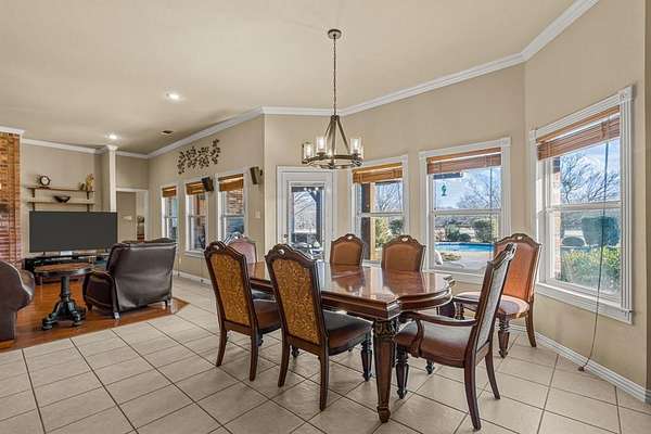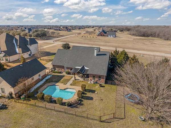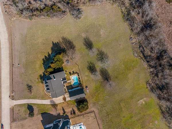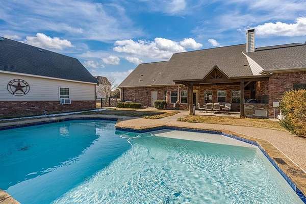 Outside, a resort-style pool, outdoor kitchen, and expansive covered patio overlook the lawn and tree-lined backyard, creating a private, nature-filled retreat for beautiful rural mornings and warm nights.