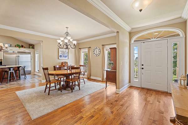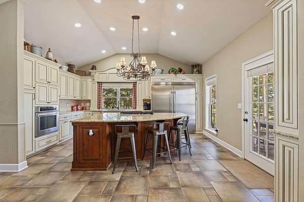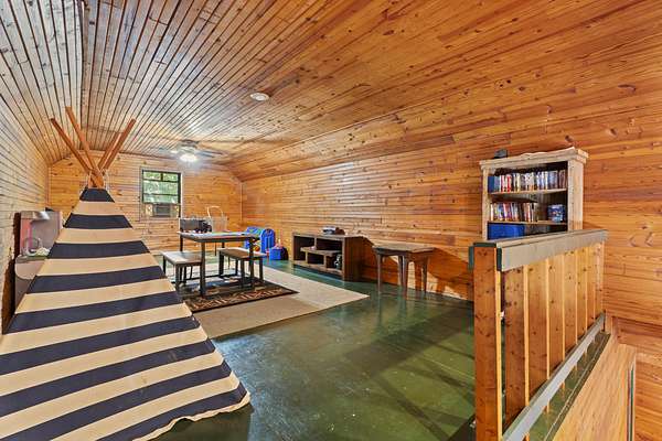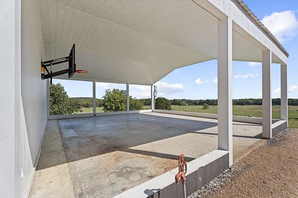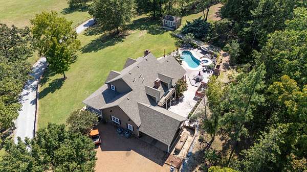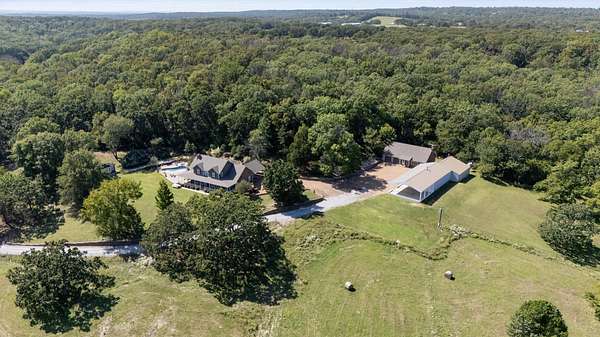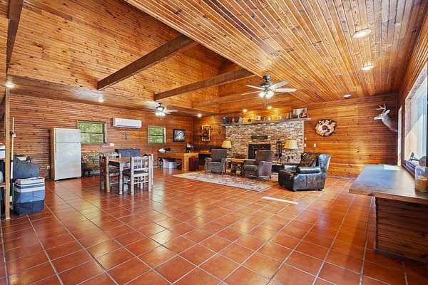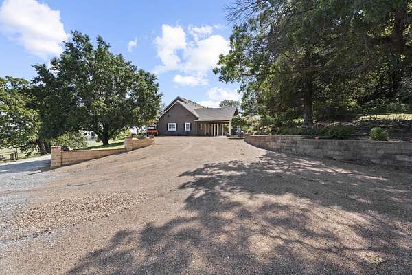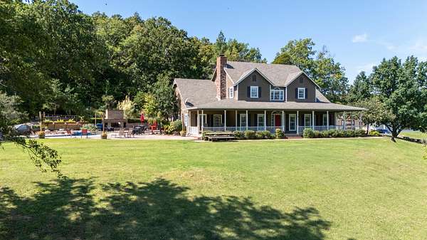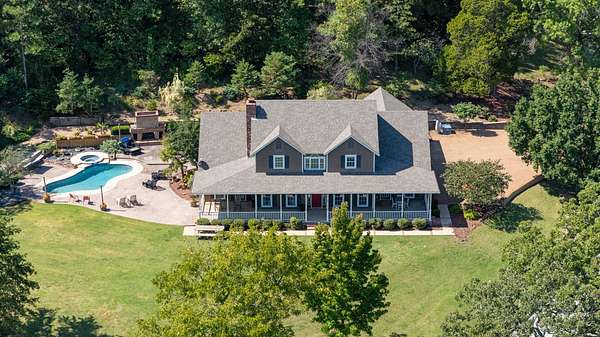 Beautiful 120-acre farm featuring a spacious 4-bedroom, 3.5-bath home with granite countertops in the kitchen, two living rooms each with its own fireplace, and a primary bedroom with fireplace located downstairs. Upstairs offers 3 bedrooms and 2 baths, providing plenty of room for family or guests. A 1-bedroom, 1-bath guest house includes a living room, fireplace, and attached garage. Outdoor amenities include a lighted and covered 1/2 basketball court, tractor storage, an in-ground pool with Cool Deck surface and outdoor fireplace, cross-fencing for livestock, 4 ponds, and a creek -- the perfect farmstead retreat!
