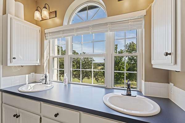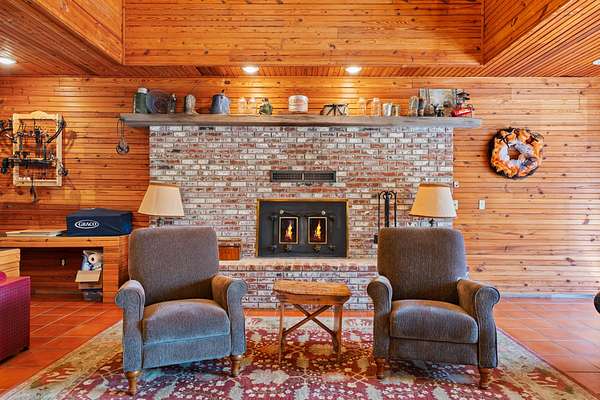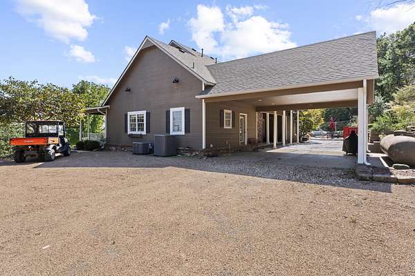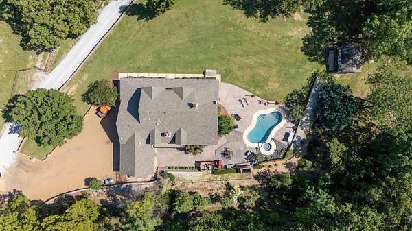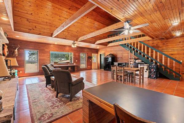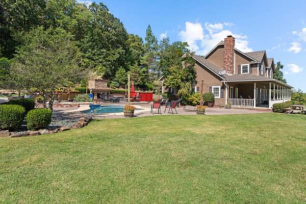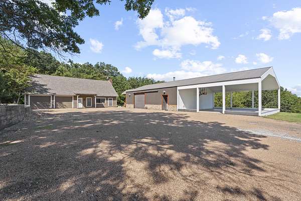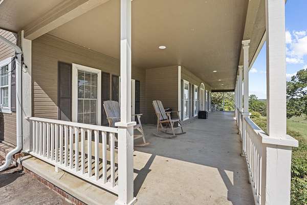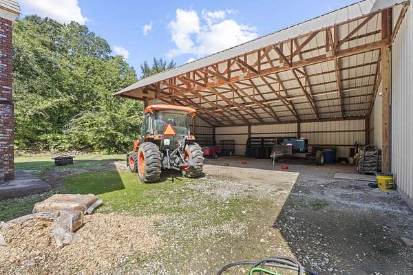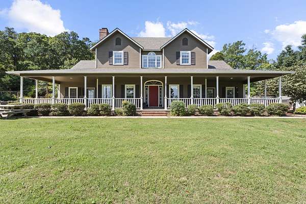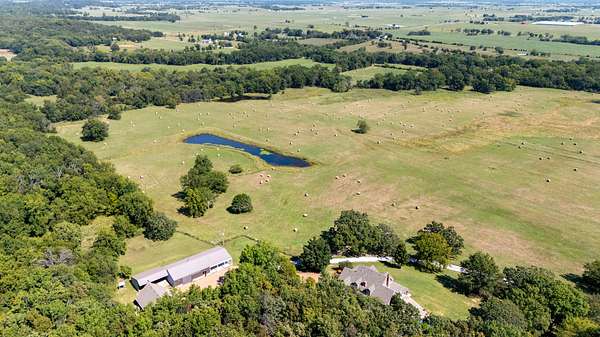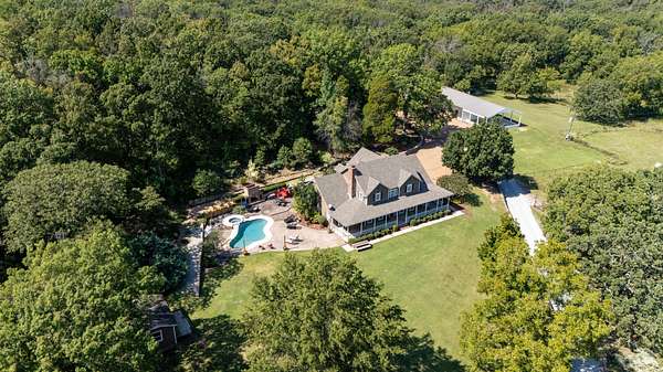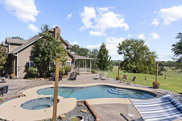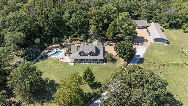 Beautiful 120-acre farm featuring a spacious 4-bedroom, 3.5-bath home with granite countertops in the kitchen, two living rooms each with its own fireplace, and a primary bedroom with fireplace located downstairs. Upstairs offers 3 bedrooms and 2 baths, providing plenty of room for family or guests. A 1-bedroom, 1-bath guest house includes a living room, fireplace, and attached garage. Outdoor amenities include a lighted and covered 1/2 basketball court, tractor storage, an in-ground pool with Cool Deck surface and outdoor fireplace, cross-fencing for livestock, 4 ponds, and a creek - the perfect farmstead retreat!