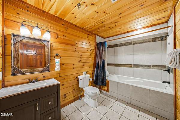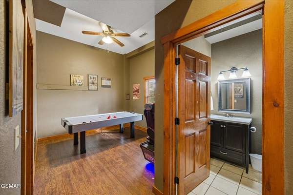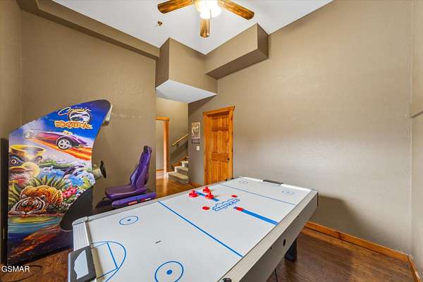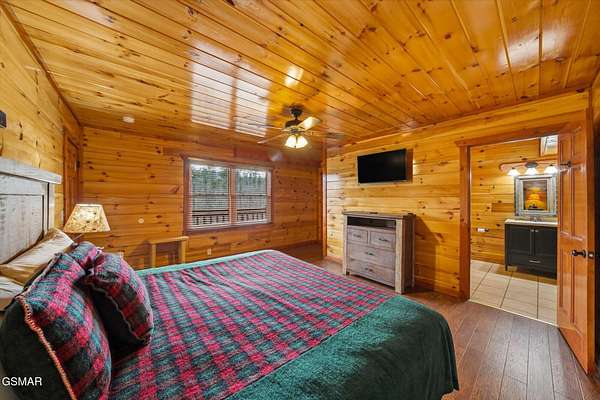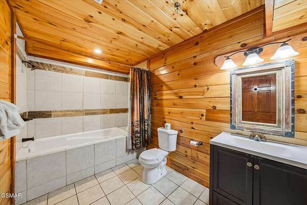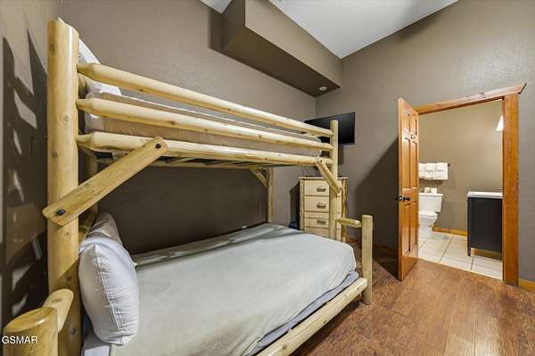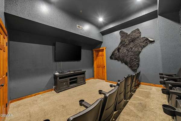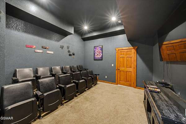 Beautiful 6 bed, 6.5 bath cabin in Sherwood Forest Resort - just minutes from the Pigeon Forge Parkway, offering over 4,500 sq ft across three levels! The open main level features a kitchen with granite countertops, stainless appliances, bar seating, and island, flowing into the dining area and a spacious living room with stacked-stone electric fireplace and vaulted, double-height ceiling. Two main-level bedrooms include en-suite bathrooms. Upstairs offers a game room with pool table and arcade games, plus two additional en-suite bedrooms. The lower level features a theater room with stadium seating for 12, a second game room with air hockey and arcade games, two more en-suite bedrooms, and a laundry room. Each level has a covered deck, with the lower deck featuring a private hot tub, plus seasonal access to the Sherwood Forest Resort pool. Additionally, enjoy paved parking for 5 cars, a laundry room, and keyless entry. Current arrangements and furniture accommodate up to 24 guests!