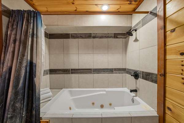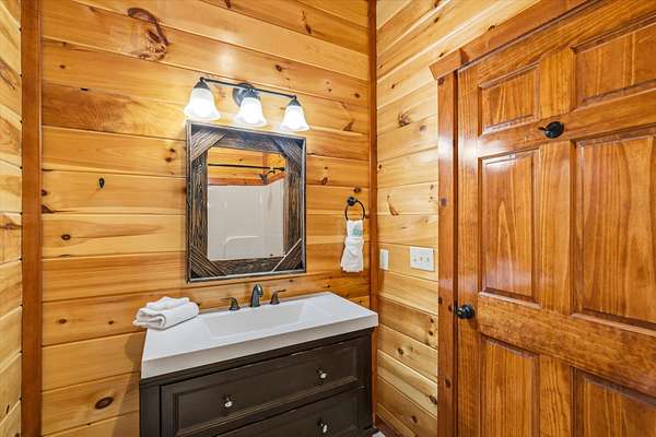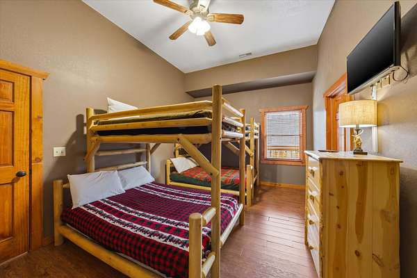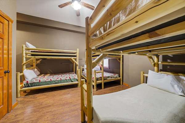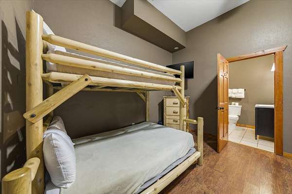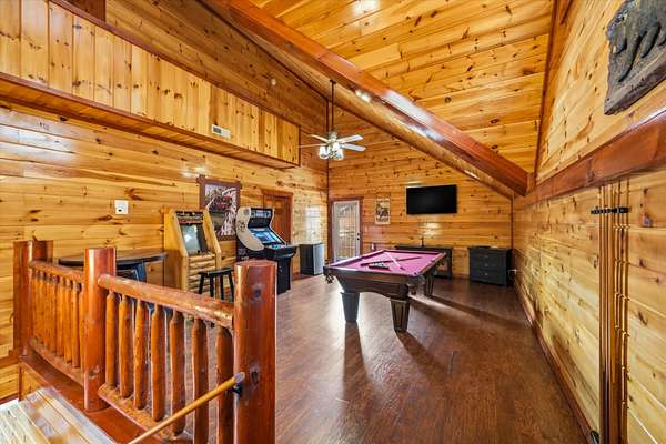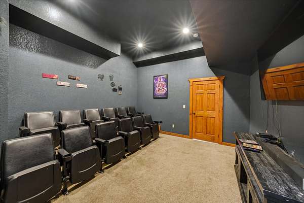 Beautiful 6 bed, 6.5 bath cabin in Sherwood Forest Resort - just minutes from the Pigeon Forge Parkway, offering over 4,500 sq ft across three levels! The open main level features a kitchen with granite countertops, stainless appliances, bar seating, and island, flowing into the dining area and a spacious living room with stacked-stone electric fireplace and vaulted, double-height ceiling. Two main-level bedrooms include en-suite bathrooms. Upstairs offers a game room with pool table and arcade games, plus two additional en-suite bedrooms. The lower level features a theater room with stadium seating for 12, a second game room with air hockey and arcade games, two more en-suite bedrooms, and a laundry room. Each level has a covered deck, with the lower deck featuring a private hot tub, plus seasonal access to the Sherwood Forest Resort pool. Additionally, enjoy paved parking for 5 cars, a laundry room, and keyless entry. Current arrangements and furniture accommodate up to 24 guests!