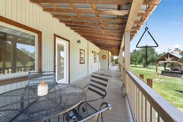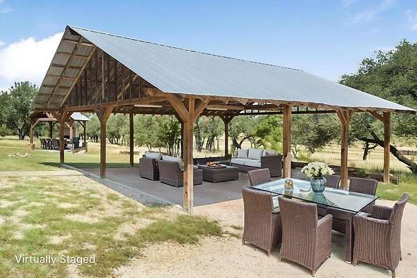 Escape to your private retreat on 10 +/- acres in the Texas hill country, boasting beautiful oak trees spread throughout the whole property with great grazing for livestock. Secured with a 5-strand barbwire fence around the whole property with keypad and remote access with your own automatic gate. As we step into this property, you'll find a 3-car detached car-port and a 3-bedroom, 2.5-bathroom home with a porch spanning the entire back of the house, perfect for enjoying peaceful mornings. A outdoor pavilion with a fireplace for evening relaxation under the stars and taking in the amazing views of the property. The kitchen features quarts countertops, stainless steel appliances. Recent updates to the home include new lighting throughout, as well as new flooring in the rooms and renovated bathrooms. Stepping outside, you'll find a well and wellhouse with a 1500-gallon water tank, with a replaced 5gpm well pump in 2023 a shop/storage building that has been updated with new electric, outlets, windows, door, and paint, offering many options for conversion into a small guest house, shop, office, or B&B. immerse yourself in tranquility and natural beauty in this amazing property.