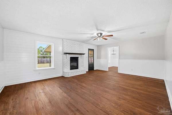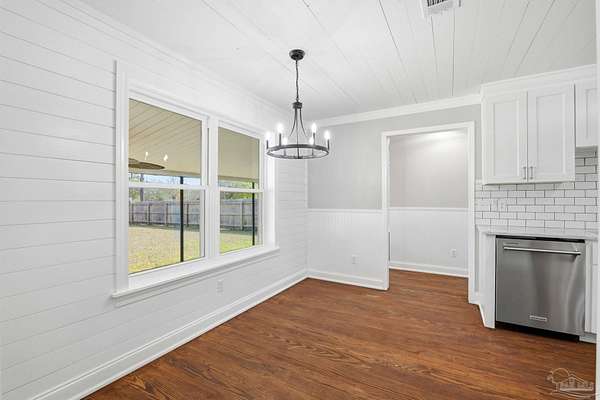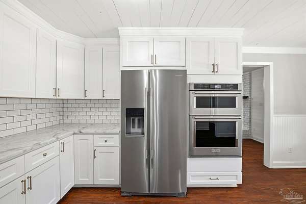 Stunning fully renovated 4BR/3BA home on 3.86 acres in Molino Meadows. Built in 1991 and updated throughout with a new roof installed October 2020, new double-hung windows (2025, with warranty), new exterior doors, new hot water heater and whole-house interior paint. Custom features include reclaimed rough sawmill-cut pine flooring, designer tile bathrooms, Fantasy White dolomite countertops, soft-close shaker cabinetry, Delta champagne bronze fixtures, custom wainscoting, built-ins, and custom wood shelving in closets. KitchenAid stainless appliance suite with combo wall oven and microwave. Floorplan includes a private mother-in-law suite, formal dining room, breakfast area, large family room with wood-burning fireplace, and a library with French doors and custom bookcases. Finished 2 car garage with trimmed windows and baseboards. Privacy fenced backyard, covered porch, and two driveway access points (front and back of the property). No HOA. Equestrian acreage. Move-in ready with premium upgrades throughout.