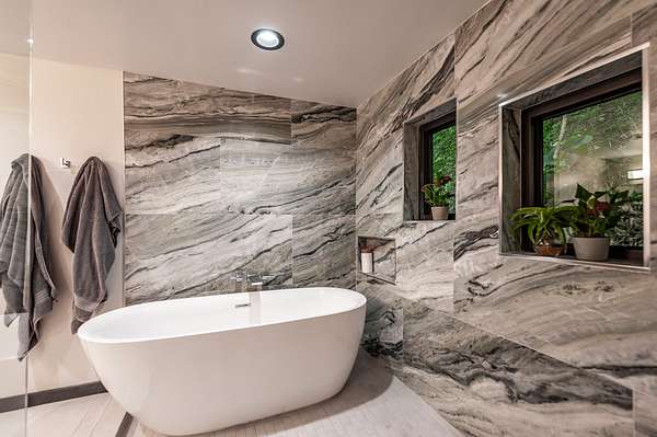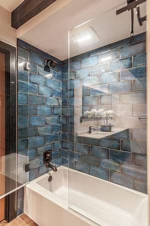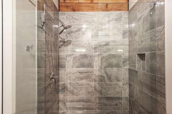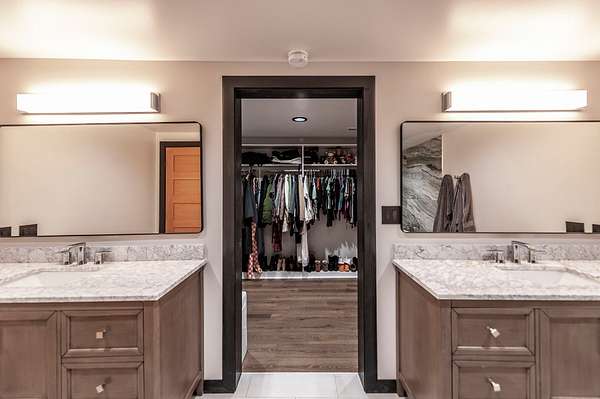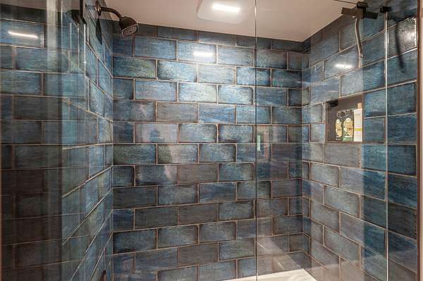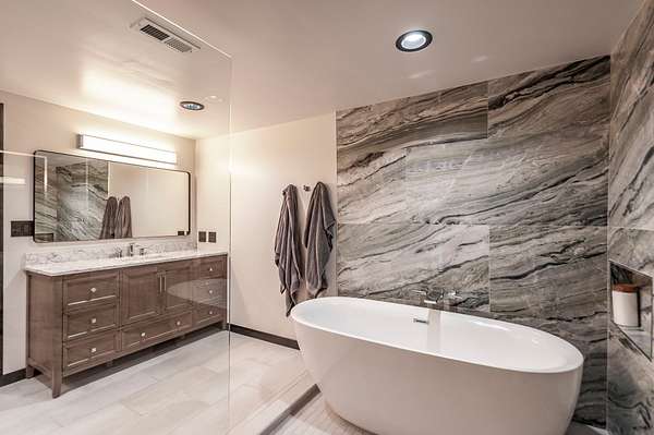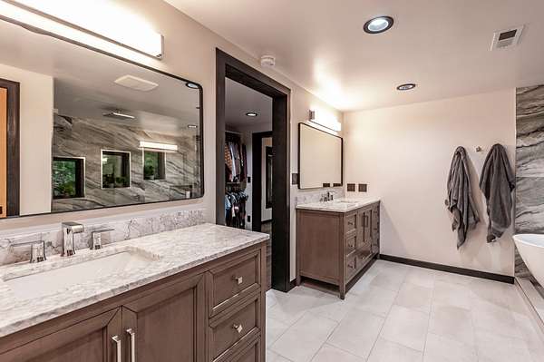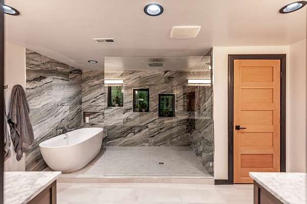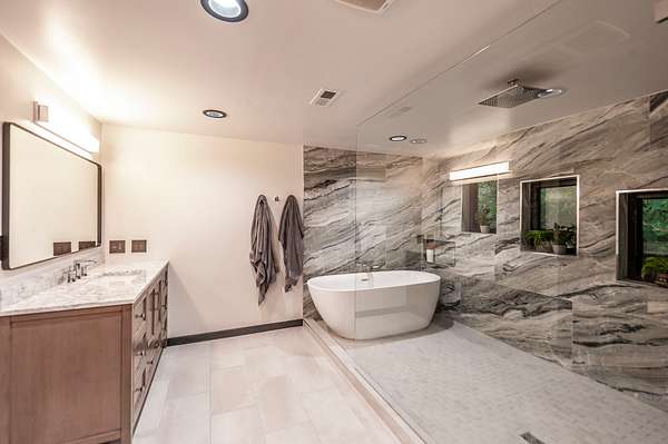 The primary suite feels like a spa retreat, complete with an oversized walk-in shower, freestanding soaking tub, and dual marble vanities. Secondary baths are equally elevated with quartz counters and sleek glass enclosures.