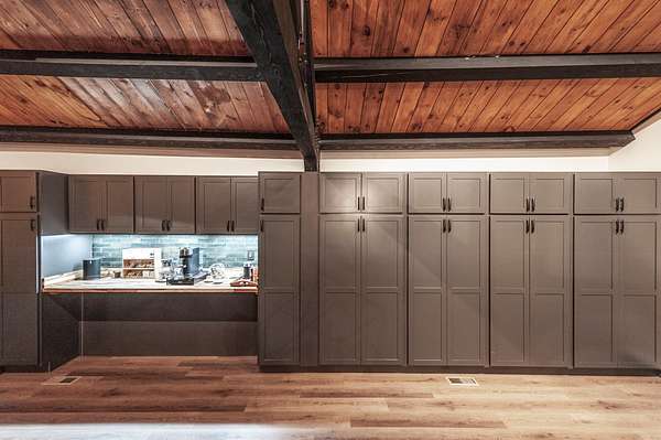 The custom designed kitchen is a true centerpiece, featuring a large quartz island with built-in motorized outlets (including wireless charging and USB), workstation sink, stand-mixer storage with power, reinforced deep drawers, stainless steel appliances, and an expansive wall of custom pantry cabinetry with a dedicated coffee bar and beverage refrigerator.